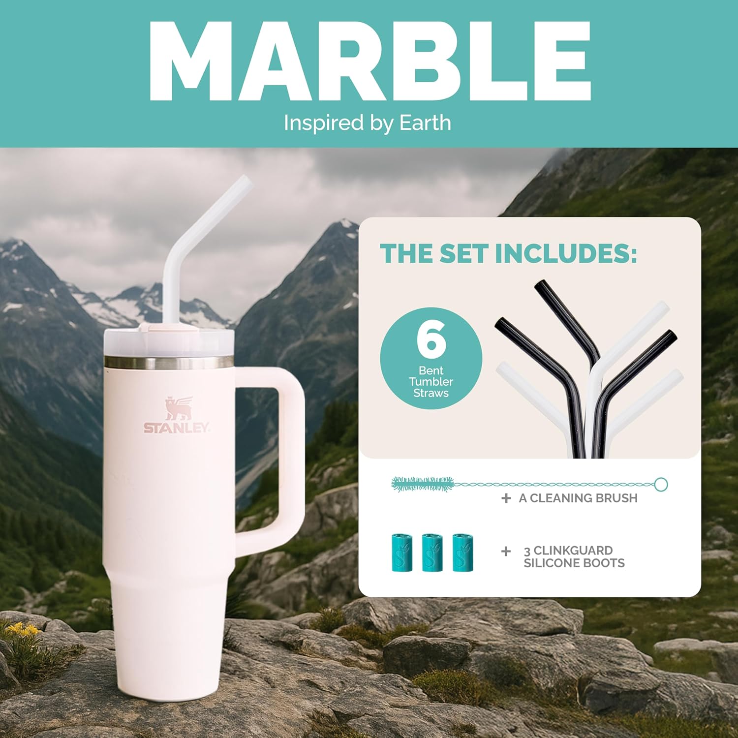 Simply Straws 12 Inch Glass Straws Bent (6-Pack) – Reusable Glass Straws for Stanley 40 Oz Tumbler, with Cleaning Brush – Durable, Dishwasher Safe, Hot & Cold Use, BPA-Free (Marble)