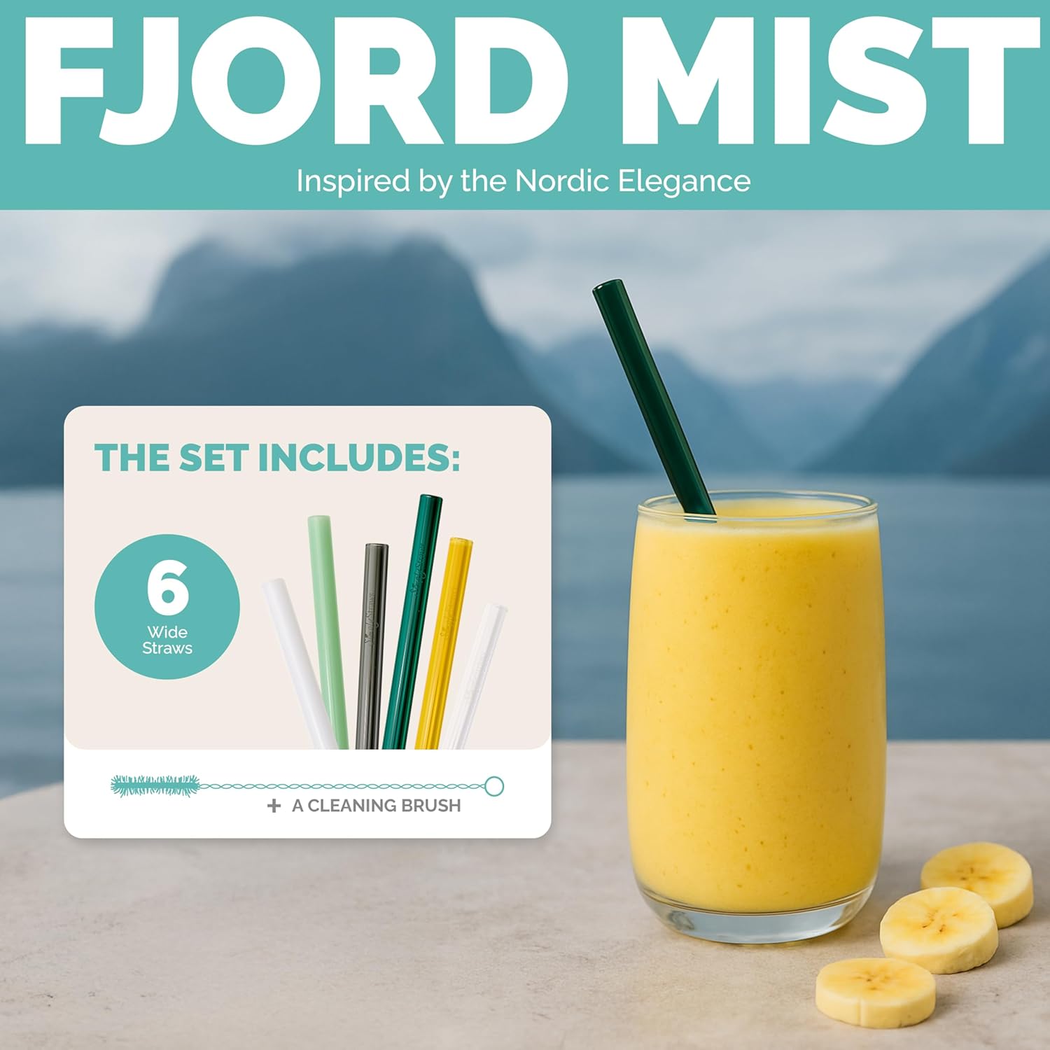 Simply Straws Wide Glass Straws (6-Pack) - 10in x 12mm Reusable Glass Smoothie Straws for Milkshakes, Juices & Slushies, with Cleaning Brush - Dishwasher Safe, Hot & Cold Use, BPA-Free (Fjord Mist)