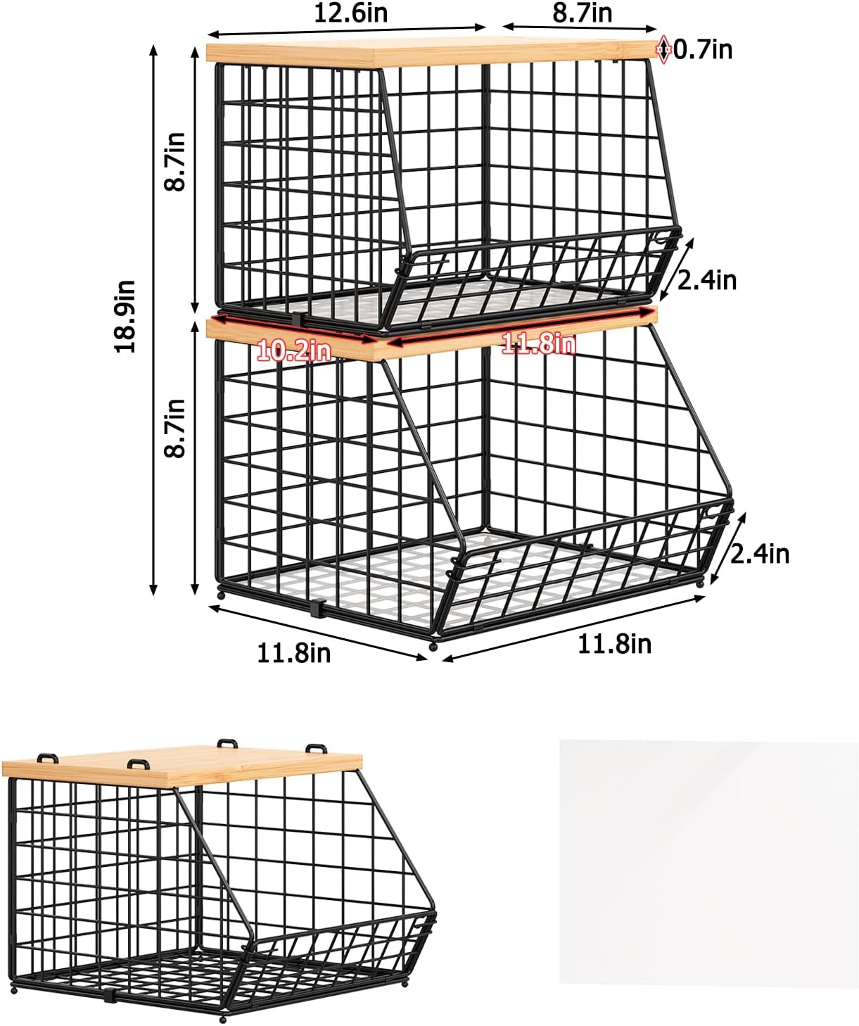 - 1. Versatile Stackable Wire Basket and Single Use: Two Large capacity kitchen baskets for storage can be stacked into a tiered design or used separately, fitting perfectly between cabinets and countertops. Stacked height:18.9in; Single basket sizes: 11.8in x 11.8in x 8.7in and 11.8in x 10.2in x 8.7in.