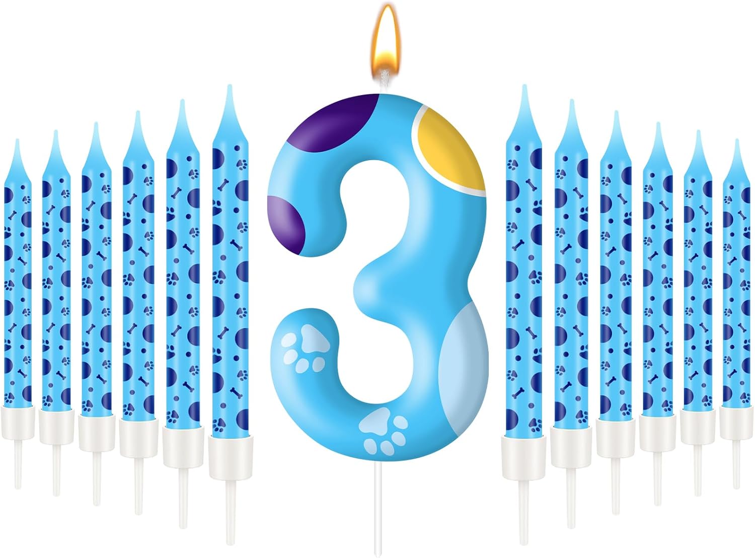 13PCS Blue Dog Paw Birthday Candles Set Cake Topper Numeral Birthday Candles for Boy Girl Dog Paw Decoration(Number 3)
