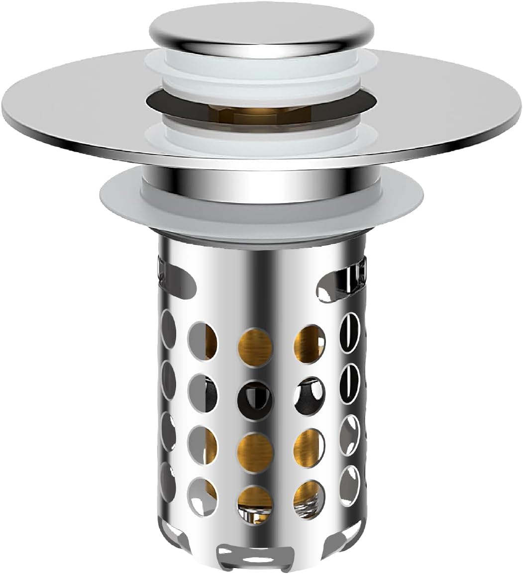- Enhanced 3-in-1 Function: Our upgraded bathroom sink stopper features a unique design that combines water storage, fast drainage, and an efficient filtration system in one. The integrated filter captures tiny objects like hair, rings, and debris to ensure smooth drainage