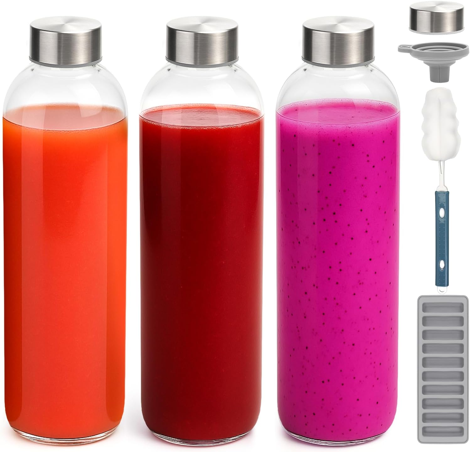- AIRTIGHT AND LEAK PROOF: Juicing Kit Bundle includes : 3 pack clear 32 oz Zukro glass juice bottles with airtight lids, a bottle cleaning brush for easy hand washing, a funnel helps you pour liquids inside the glass containers, an ice stick tray makes long and narrow ice cubes for adding ice easily, extra 1pc stainless steel airtight lids to ensure that the reusable glass bottles always remain sealed. Get our juicing bottles in bulk packs as gift for your whole family and friends.