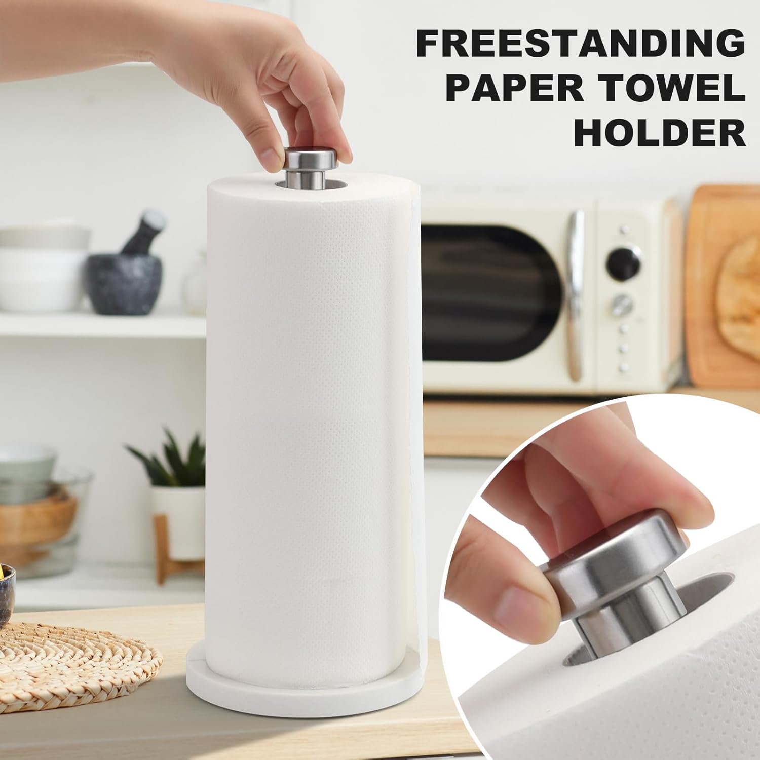 - Elegant and Marble Base: standing paper towel holder with heavy weighted marble base is more stable and attractive than the others, and the marble base with high wear resistance brings your home a beautiful style and appealing taste.