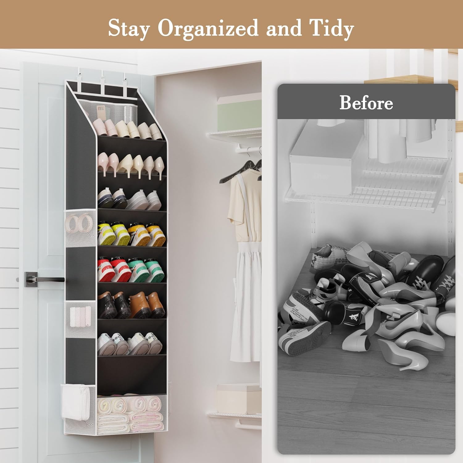 - Versatile Usage: More than just a shoe storage! This multi-functional over the door organizer solution is also great for organizing baby essentials, bathroom supplies, cleaning suppliers, kitchen items, and more