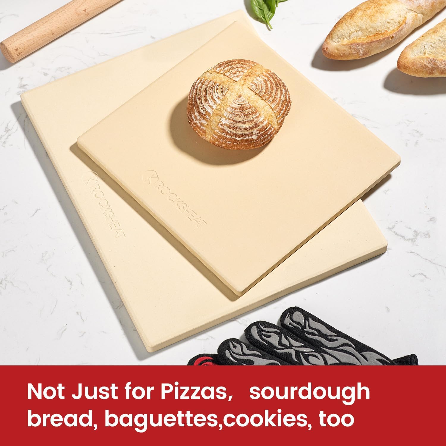 - ROCKSHEAT Rectangular 15" × 12” × 0.6" Pizza Stone, a versatile addition suitable for ovens, grills, and BBQs. Its generous size is perfect for 12-inch pizzas and a variety of other baked goods, making it an essential for home use and entertaining at pizza parties.