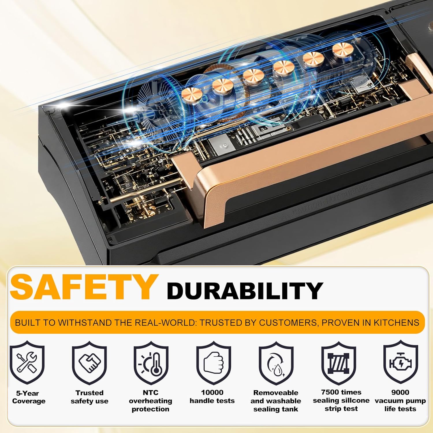 - 【Premium Sealing System】 As a premium vacuum sealer, our intelligent dual‑heat, dual‑strip mica design auto‑adjusts temperature to bag edges and moisture. This vacuum sealer for food and food sealer delivers perfect, leak‑proof seals every time—no wrinkles, no freezer burn—making it the ultimate sealing machine.