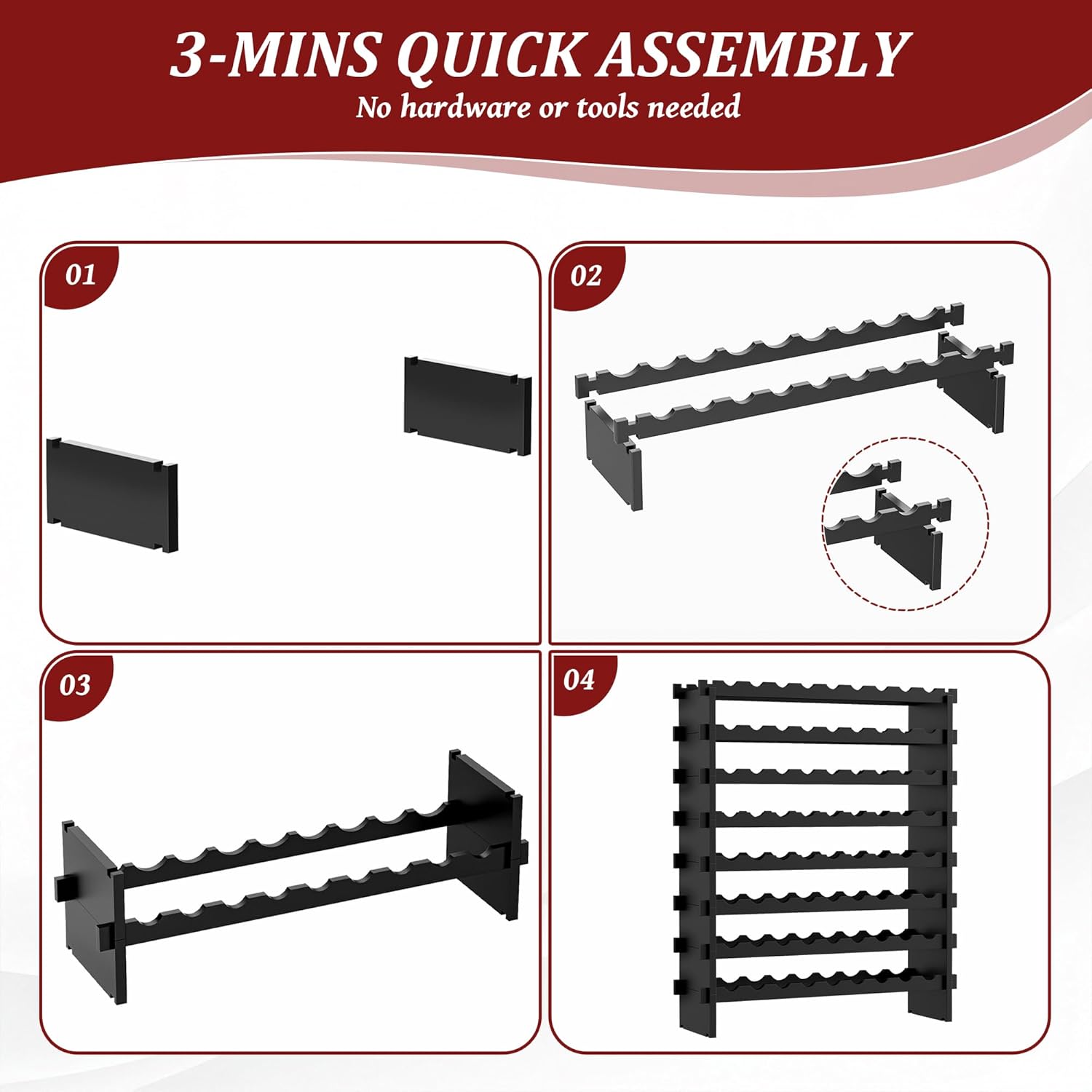 - No Tools 2 MIN Setup: The modular wine stacker is very easy to assemble. The freestanding 8-tier modular wine display shelf comes in 16 wave bars & 16 blocks that easily snap together,no need for any hardware or tools! Assemble in just 2 minutes or less