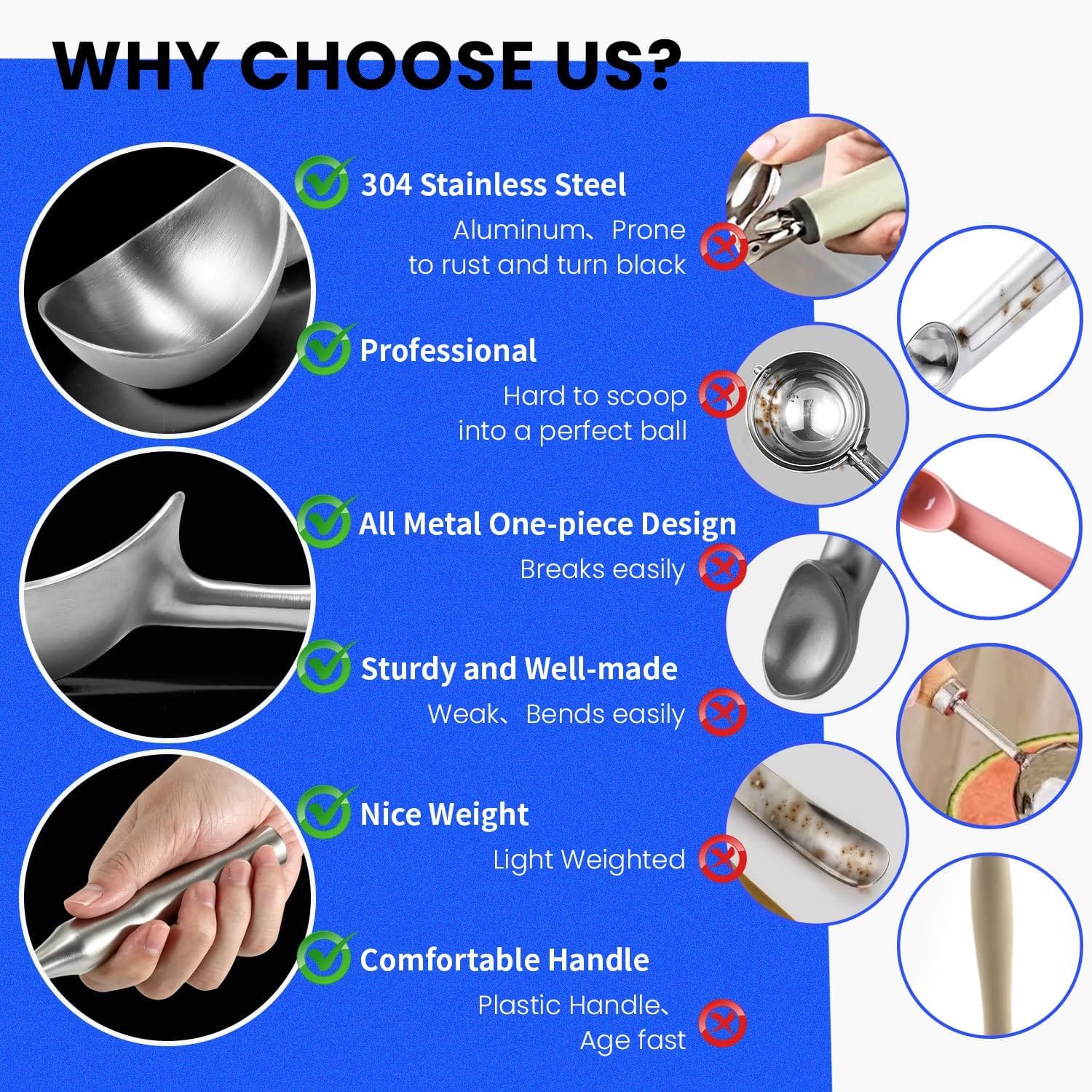 - NON-SLIP HANDLE - Designed with an ergonomic, bamboo-inspired handle, this ice cream scooper offers a non-slip, secure grip for comfortable scooping. Its well-balanced weight provides optimal leverage, making it ideal not only for ice cream but also for scooping watermelon, cookie dough, or sorbet with ease, making summer better