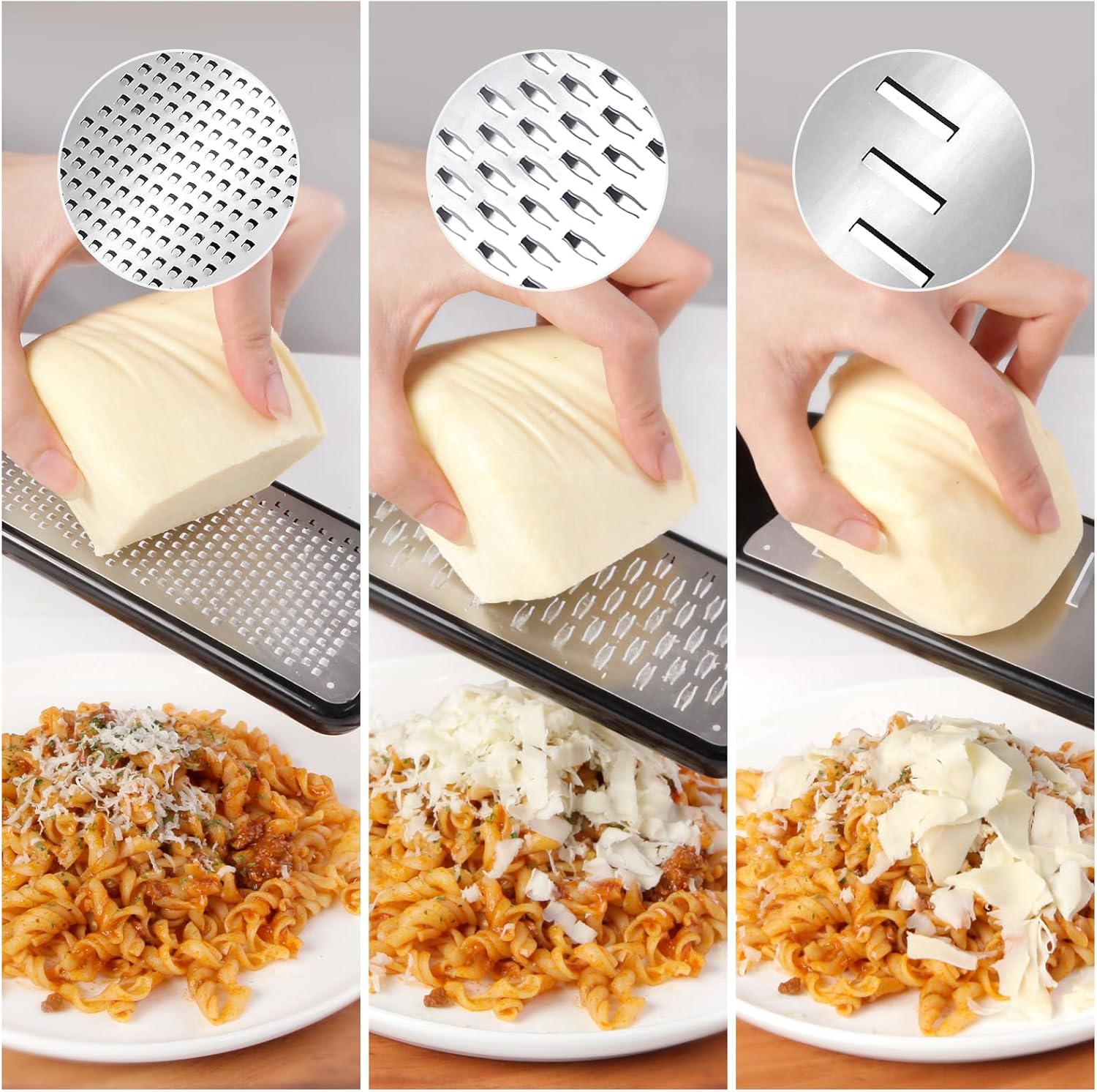 - Cheese Grater Set of 3: Grater with Fine, Ribbon and Slicer Blades. Each blade adopts etching technology, which is uniform, sharp, and not easily clogged. Super cost performance portfolio.