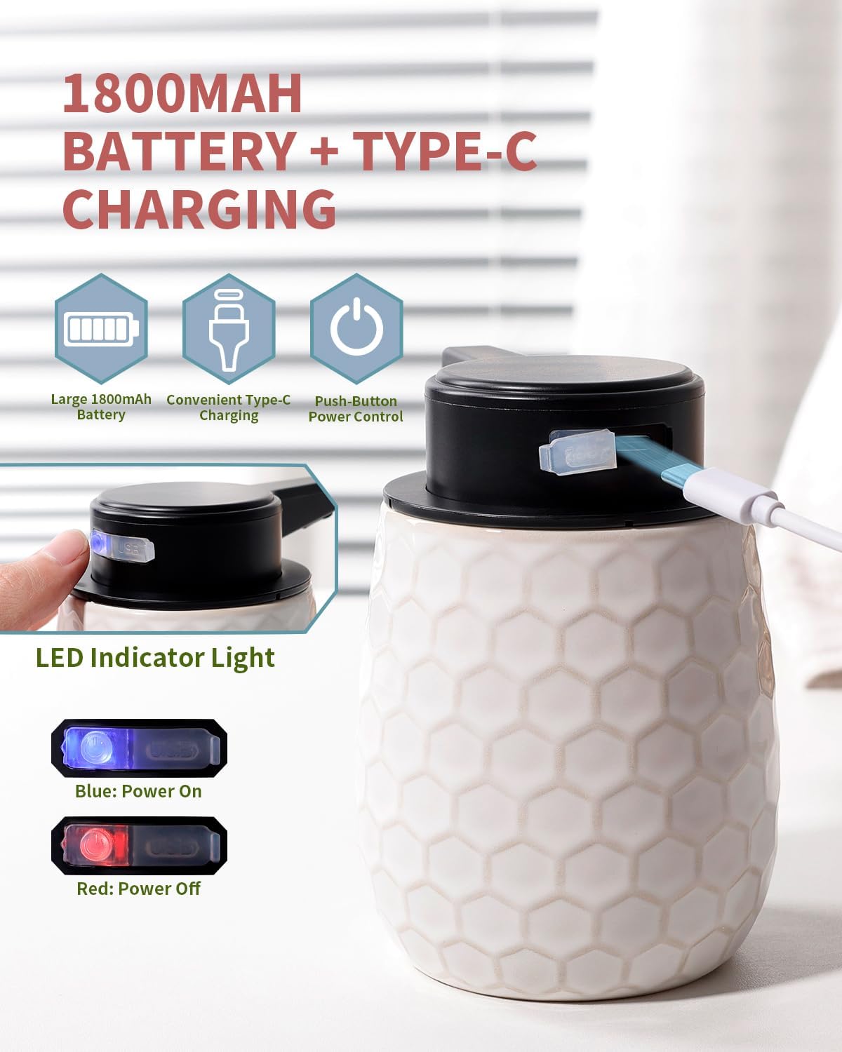 - USB-C Rechargeable Battery: No more frequent battery changes. This ceramic soap dispenser comes with a built-in 1800 mAh battery and convenient USB-C charging. One full charge powers your foaming hand soap dispenser for up to 3–4 months of daily use.