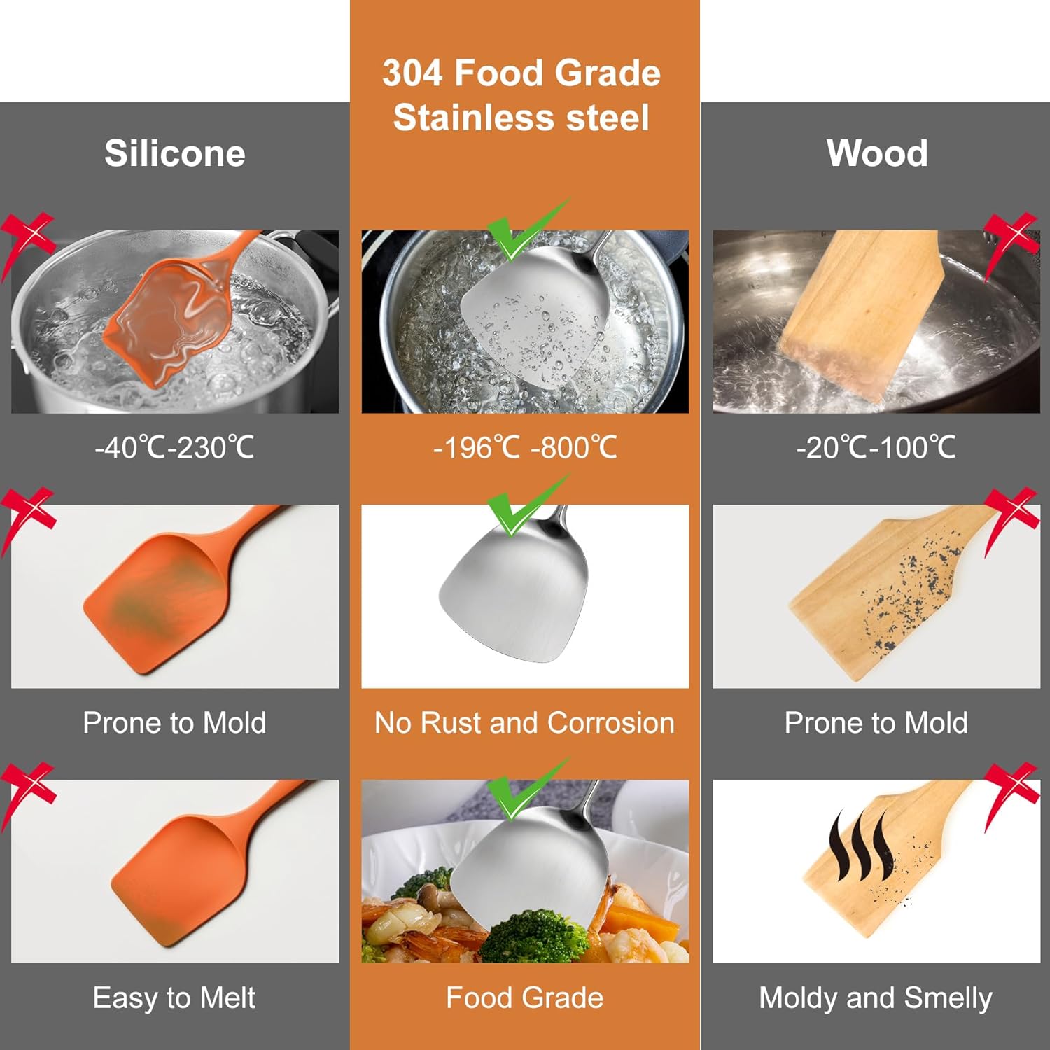 - DURABLE & ANTI-RUST: Crafted from heavy duty 304 stainless steel and forged in 1-piece, these all metal cooking utensils are built to last. They're sturdy, anti-rust, and designed to withstand daily use. No more worrying about utensils bending or rusting after a few uses