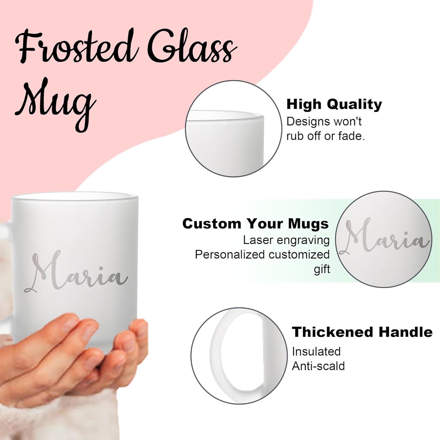 - Personalized Mugs With Names: Our personalized engraved mugs can be personalized with a custom name, initials and a heartfelt message. This coffee mug is made of glass and has a sturdy handle to fit any size hand.