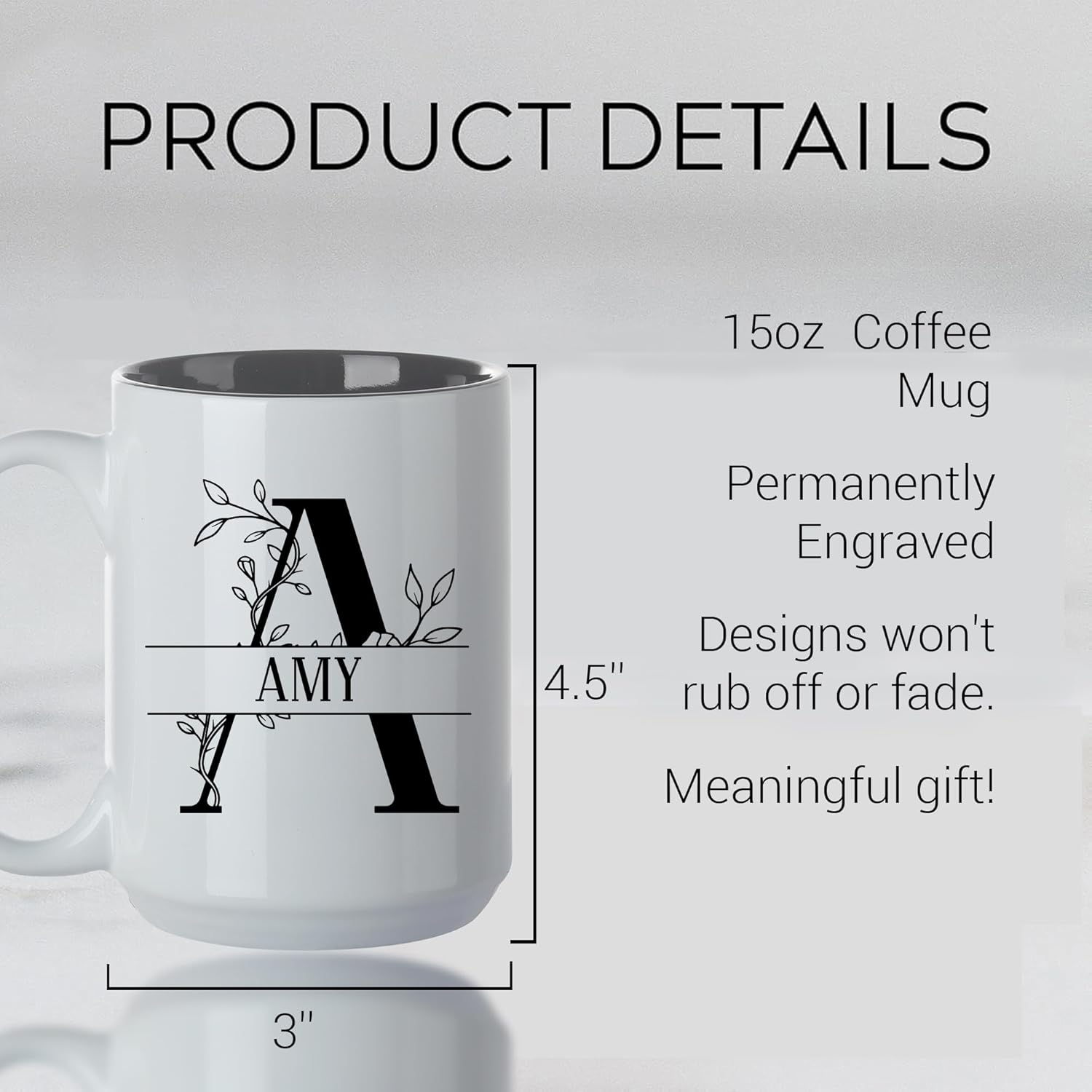 - Personalized Mugs With Names: Our personalized engraved mugs can be personalized with a custom name, initials and a heartfelt message. This coffee mug is made of ceramic and has a sturdy handle to fit any size hand.