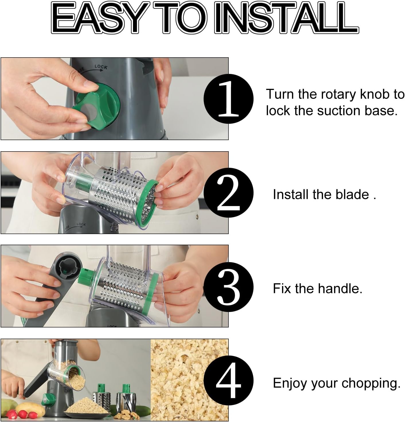 - Three blades for various kitchen needs: slicing, coarse shredding and fine shredding. The rotary grater is ideal for grating cheese, potato, carrot, cucumber, radish, nuts, chocolate, broccoli, etc. for pizza tops, cauliflower rice, hash brown and so on