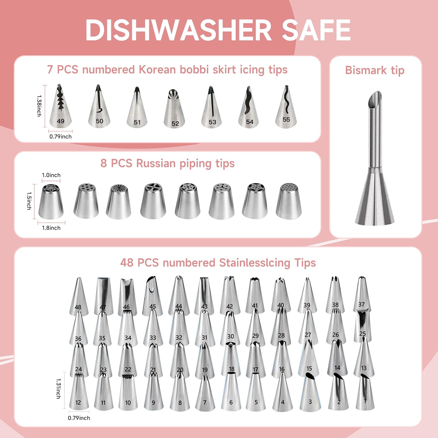 • Piping Bags and Tips Set: Includes 64 numbered icing piping tips, 30 disposable & 2 reusable 12” frosting pasty bags. Allow you to create a variety of designs, including simple dots and lines as well as intricate flowers and leaves. The included coupler makes changing tips on your piping bags a breeze without emptying the bag or creating any mess.