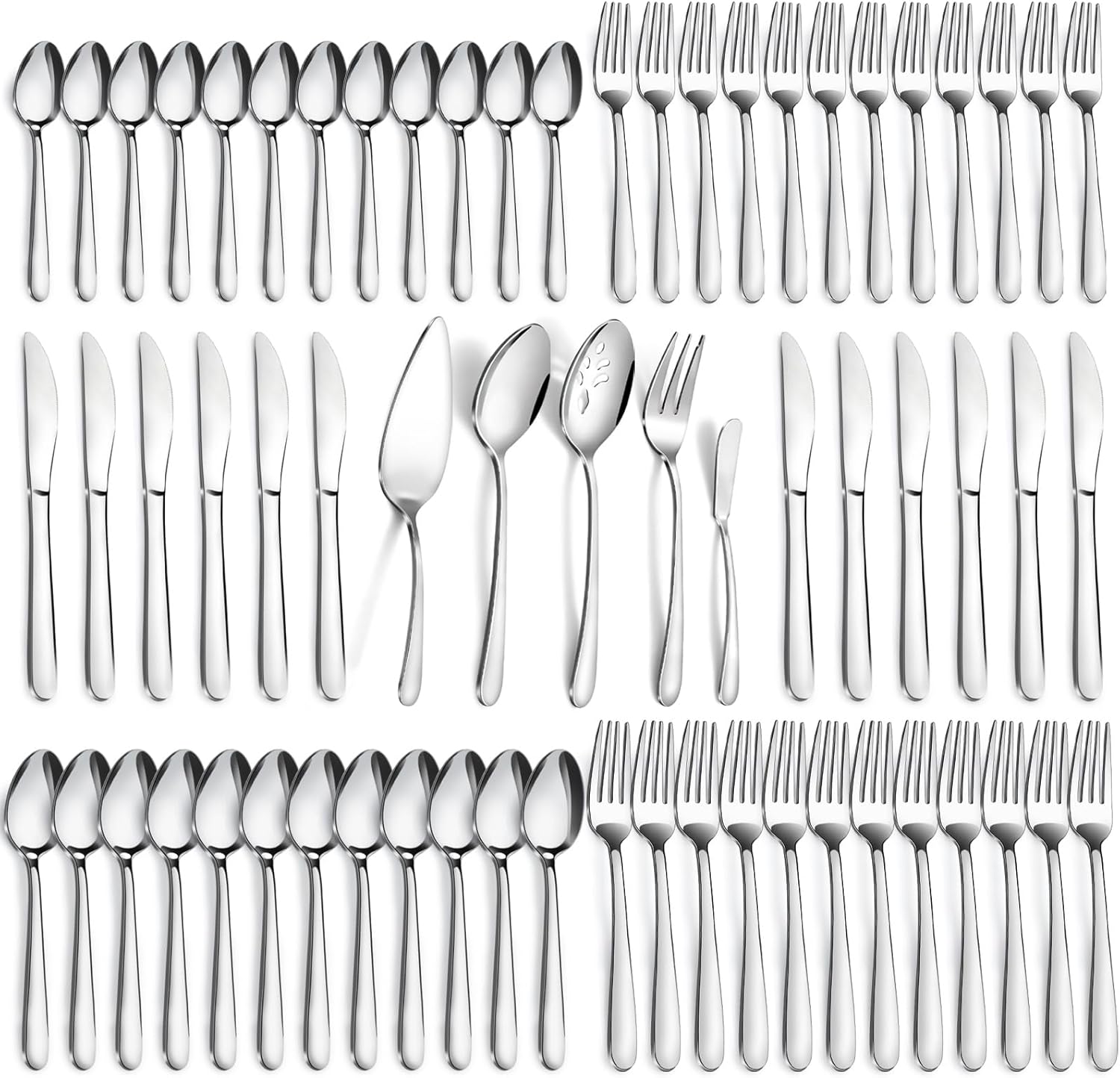 - 【65-Pieces Flatware Set For 12】Our 65 pieces silverware set contains 12 dinner spoons, 12 teaspoons, 12 dinner forks, 12 salad forks, 12 dinner knives. In addition to this, it also comes with 1 serving fork, 1 butter knife, 1 pie server, 1 serving spoon and 1 serving slotted spoon. Ideal for home use or for important occasions.