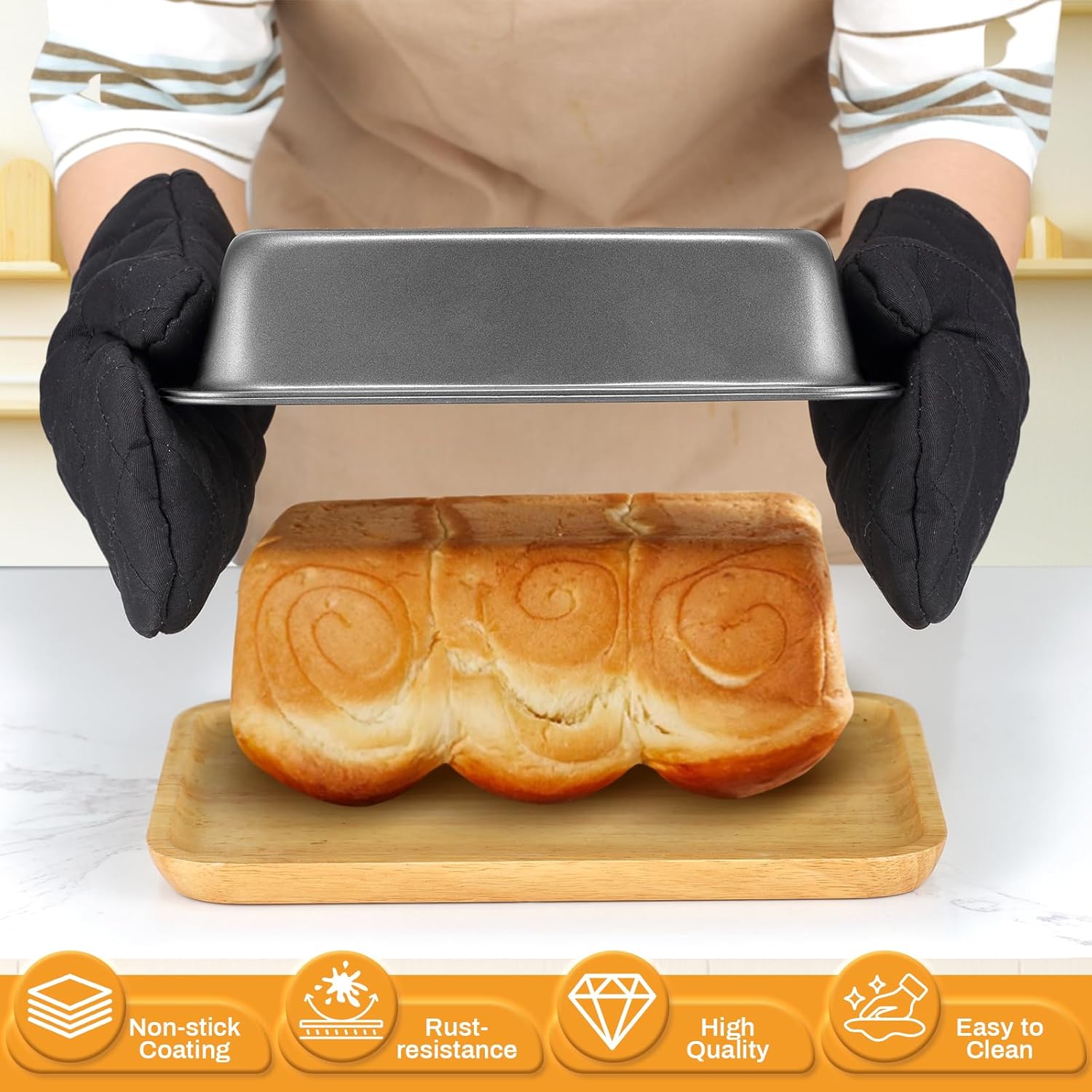 - All-in-One Set: Ideal for baking, roasting, and beyond, this 10-piece baking set makes a perfect starter kit for novice bakers. It includes 1 roasting pan(15.3*11.6*3.5 IN), 1 baking sheet(15.9*11.9*0.8 IN), 1 loaf pan(10.7*5.8*2.7 IN), 2 6-cup muffin pans(10.2*7.0*1.4 IN), 2 square cake pans(9.2*8.5*2.1 IN), 1 deep cake pan(8.7*8.7*1.7 IN), 1 shallow cake pan(8.7*8.7*1.1 IN), and 1 cooling rack(14.6*10.9 IN), meeting all your baking needs. It also comes with a pair of cotton oven mitts, ensuring a comfortable and safe baking experience