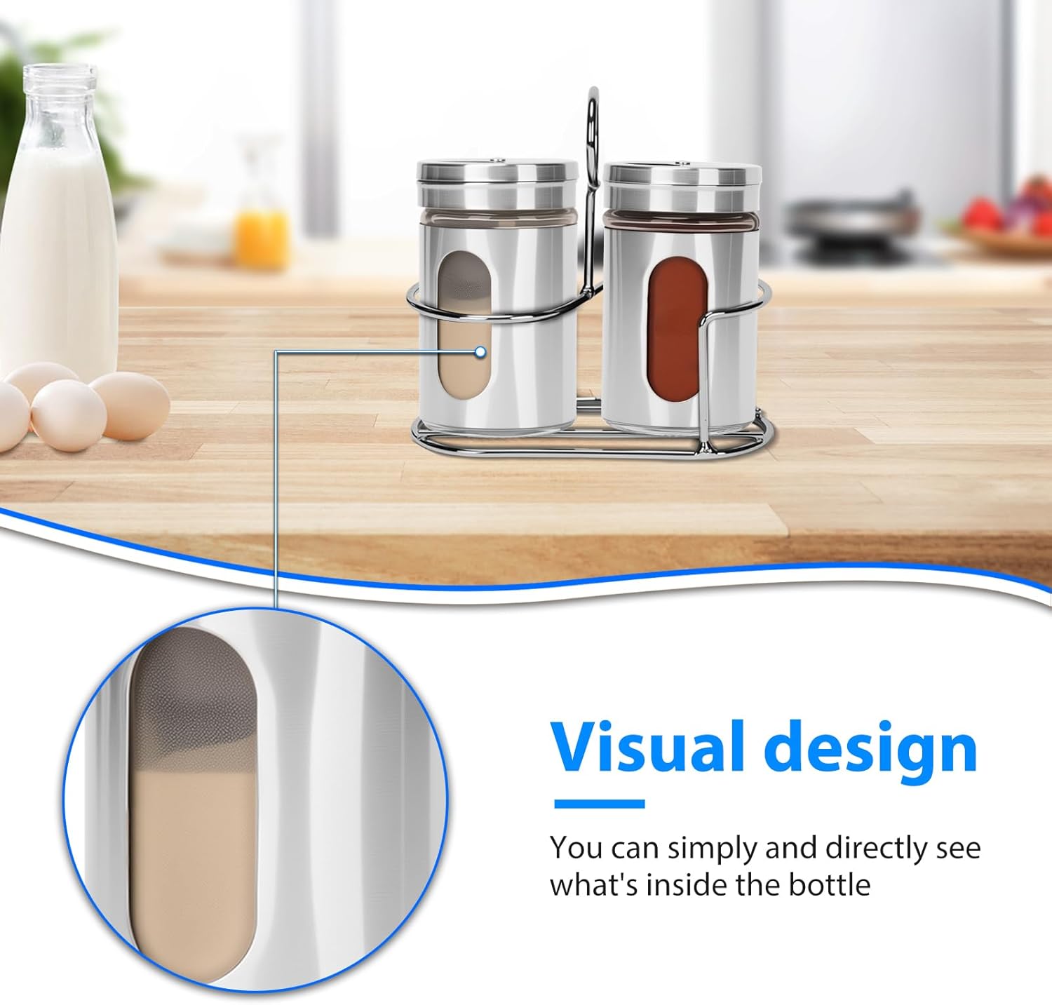 - Made of lead-free glass and stainless steel with adjustable holes for repeated use,With glass viewing ports. the Mini Salt and Pepper Shaker Set comes with an easy spice rack and is perfect for countertop organizers!