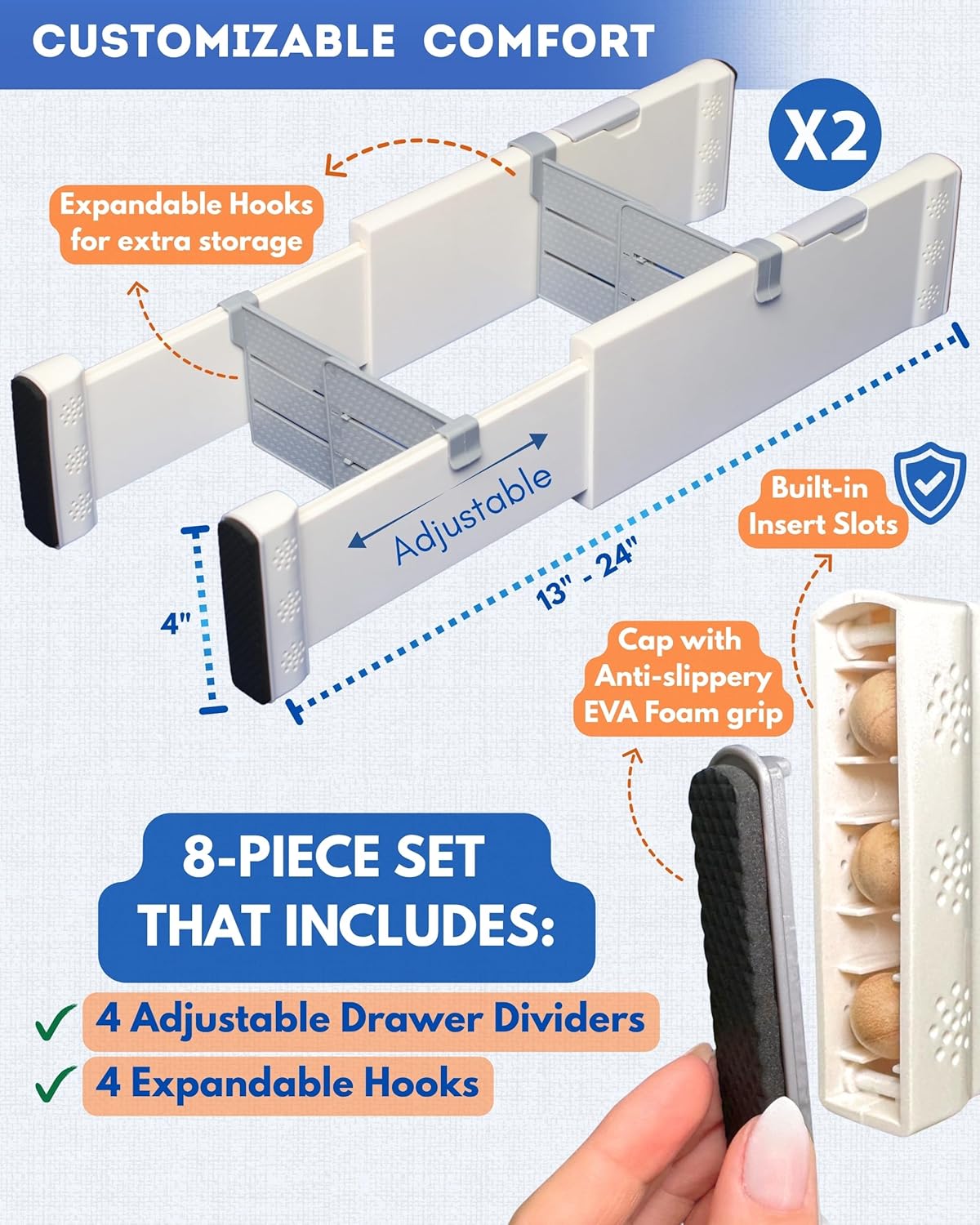 - ADAPTED TO YOUR NEEDS: These large expandable drawer dividers are built to make clothing organization effortless. With an extendable design from 13-inches to 20.4-inches, our dividers for drawers organizer adapt to any drawer and space, keeping everything neat and at hand.
