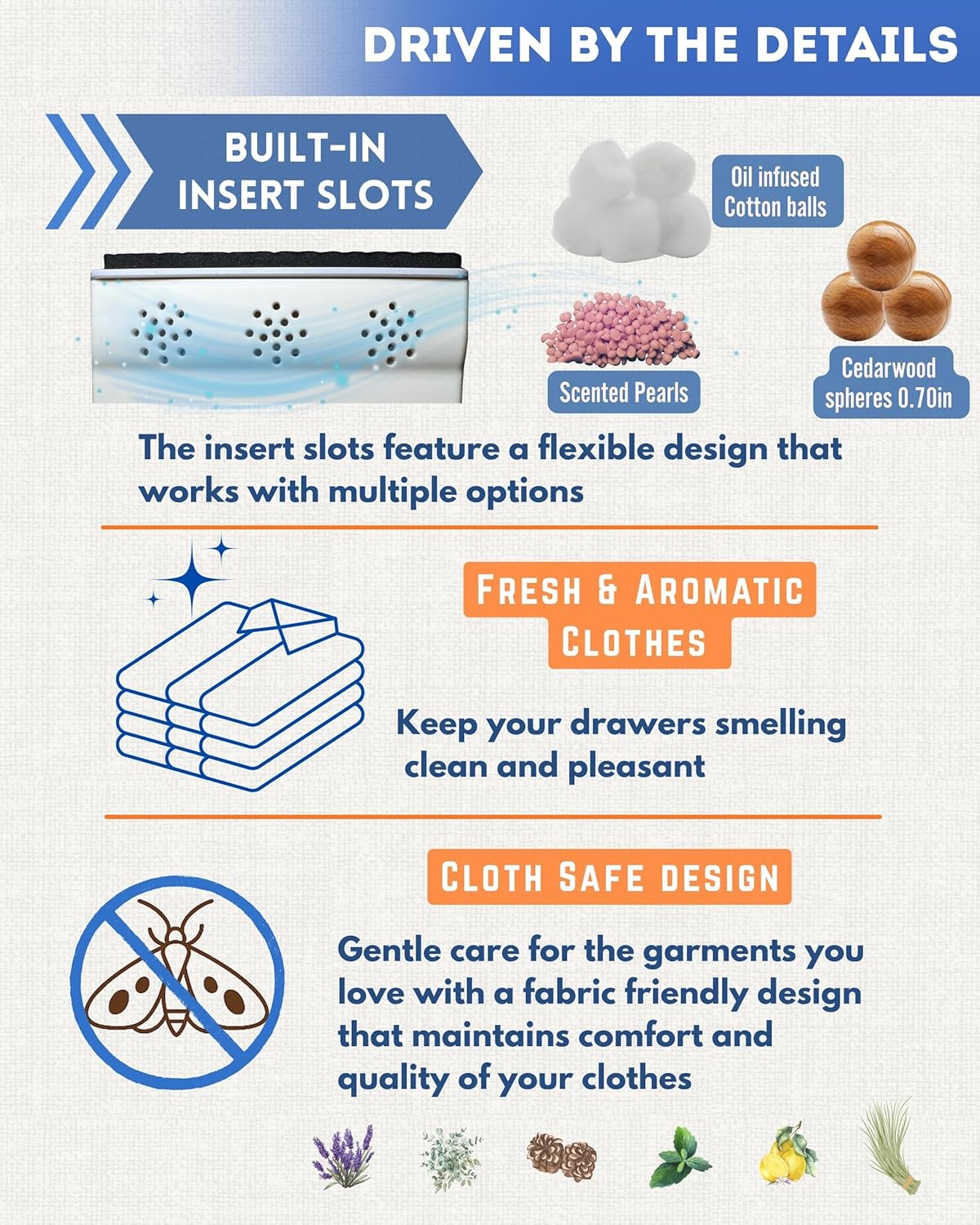 - BUILT-IN SLOTS FOR SUBTLE SCENTS: What makes the Enjoy Diverso clothes separator for closet truly distinctive are the 3 built-in slots at each end, thoughtfully designed to put essential oils, mothballs, closet deodorizers or scented beads, which will make your drawers or closet smell divine!