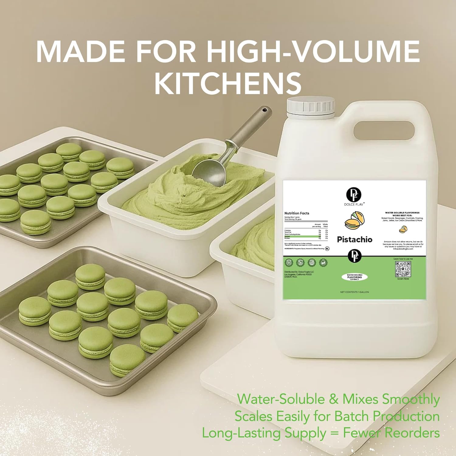 - <li><strong>Premium Pistachio Flavoring</strong> – Deliver a rich, nutty pistachio taste to desserts, ice cream, beverages, and more. Perfect for creative recipes and specialty offerings.</li>