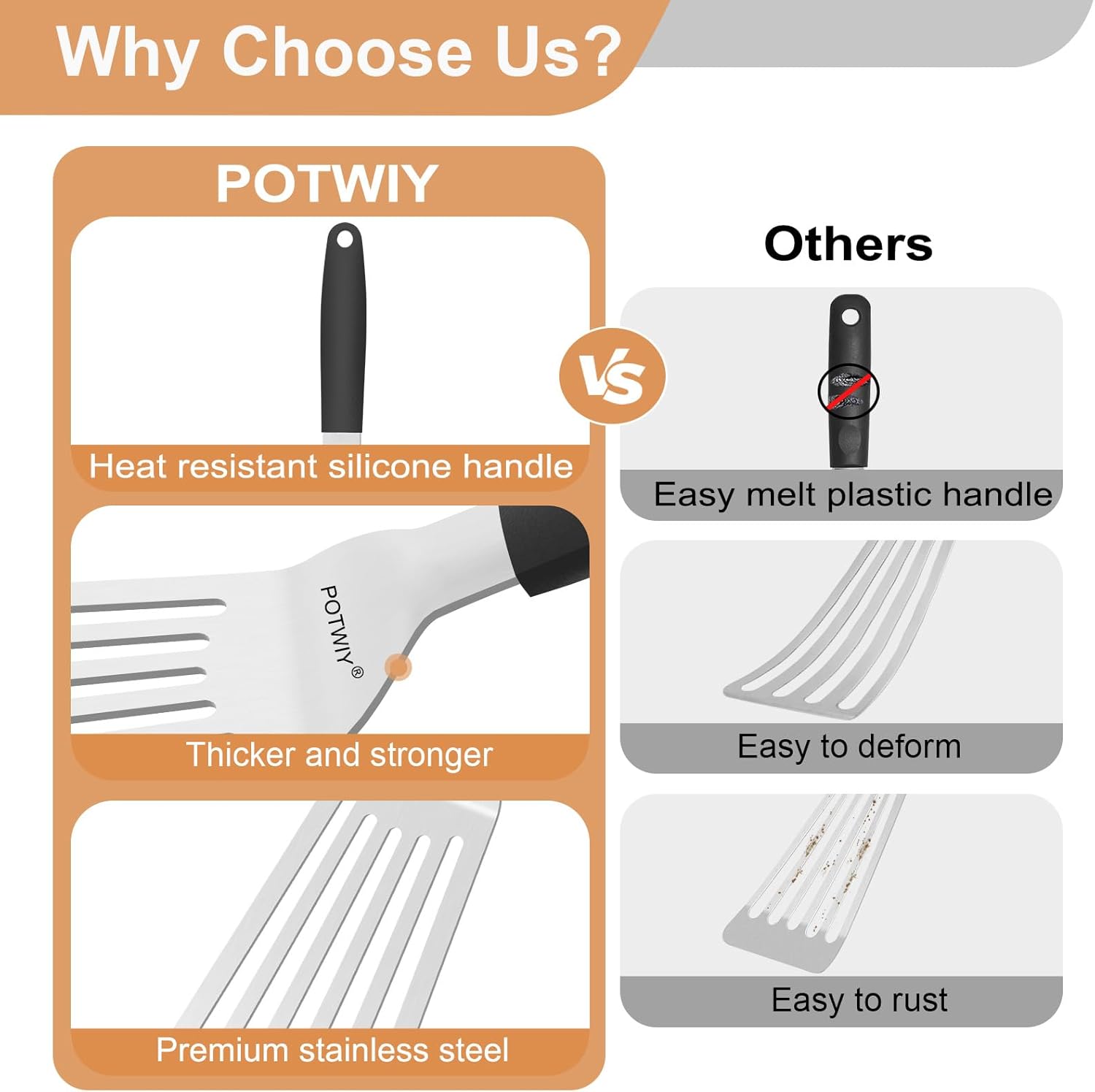 - Precision Design: The wide blade of the metal spatula with a thin beveled edge can easily slide under the food for convenient flipping and transfer. The slotted spatula design can drain grease quickly and efficiently