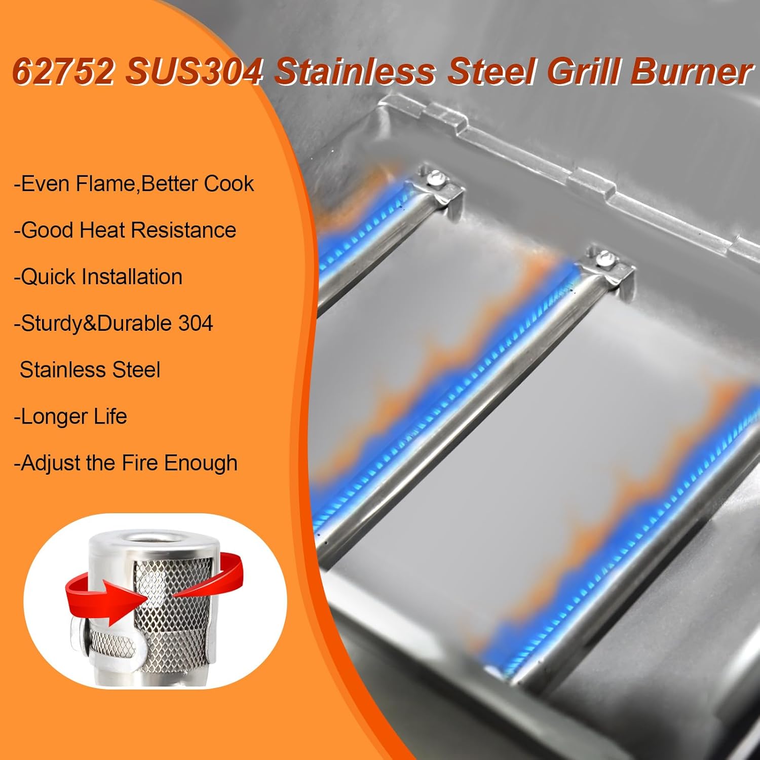 - Stainless Steel Grill Burner:The sturdy & durable 304 stainless steel burner tube is more durable than other products, non-magnetic, and has a long service life, it is an ideal choice for replacing grill burner. The burners provides a stable airflow throughout the grilling process, which can better retain and transfer heat, making the heat transfer more uniform and allowing the food to be cooked evenly on the grill