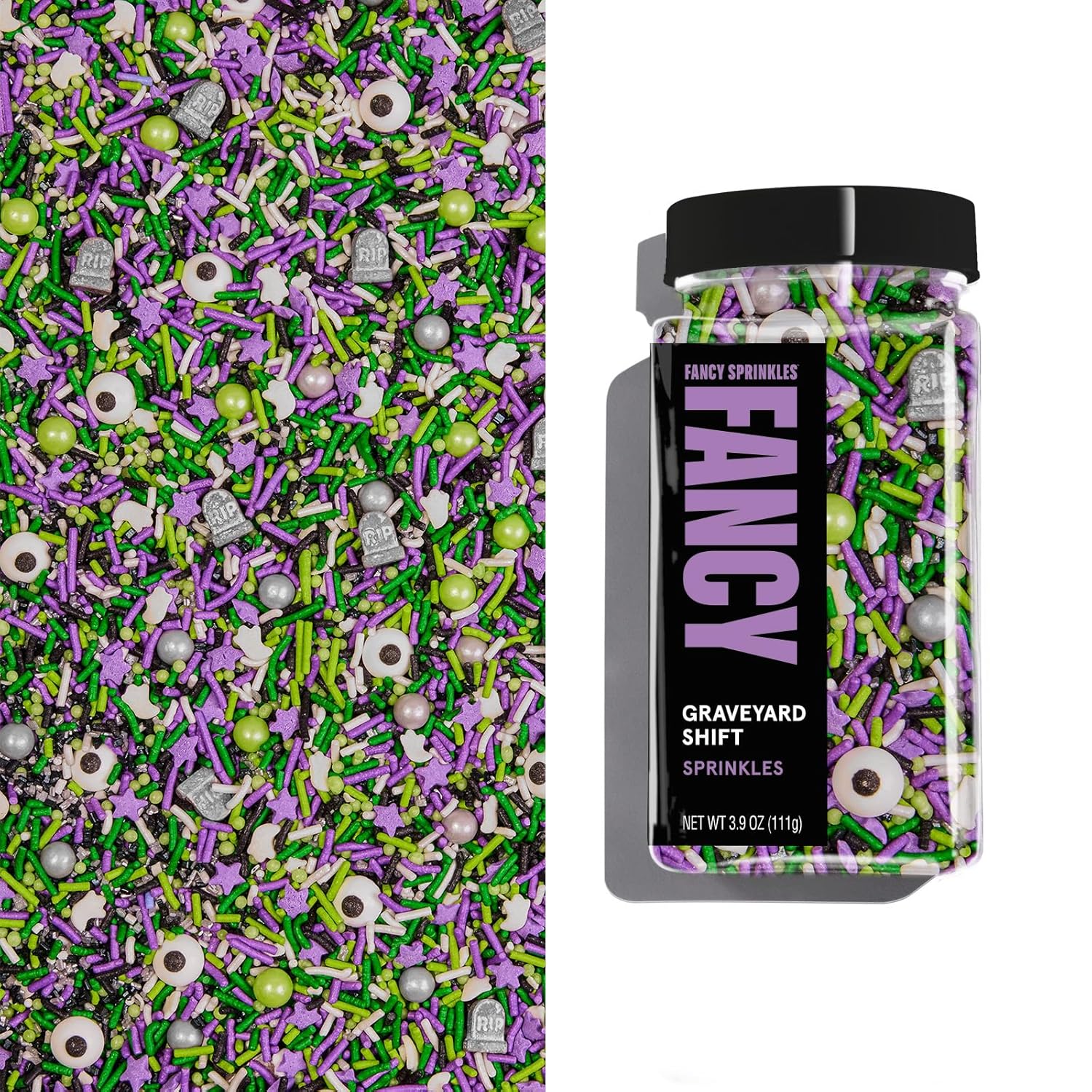 Fancy Sprinkles Limited Edition Halloween Graveyard Shift Purple and Green Crunchy Sprinkles, Plus Candy Eyeballs, Ghostly Confetti, and Eerie Tombstone Shapes (0.5c)