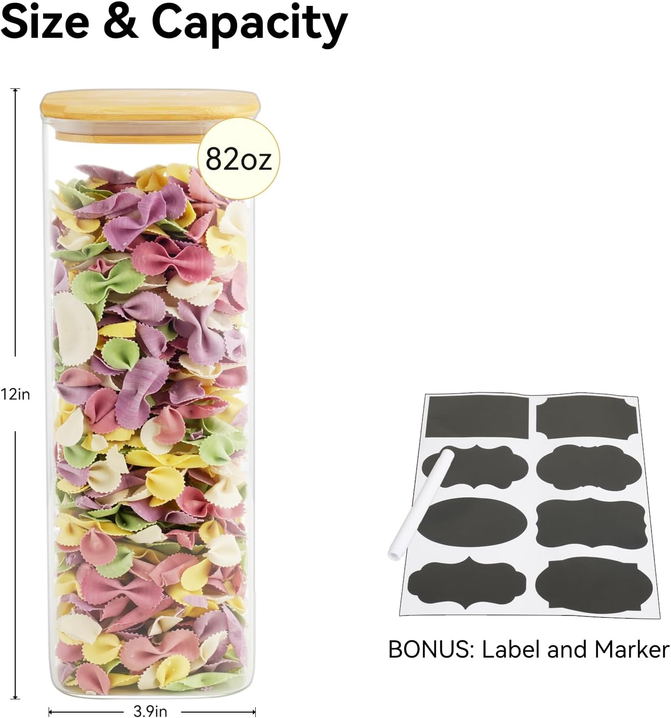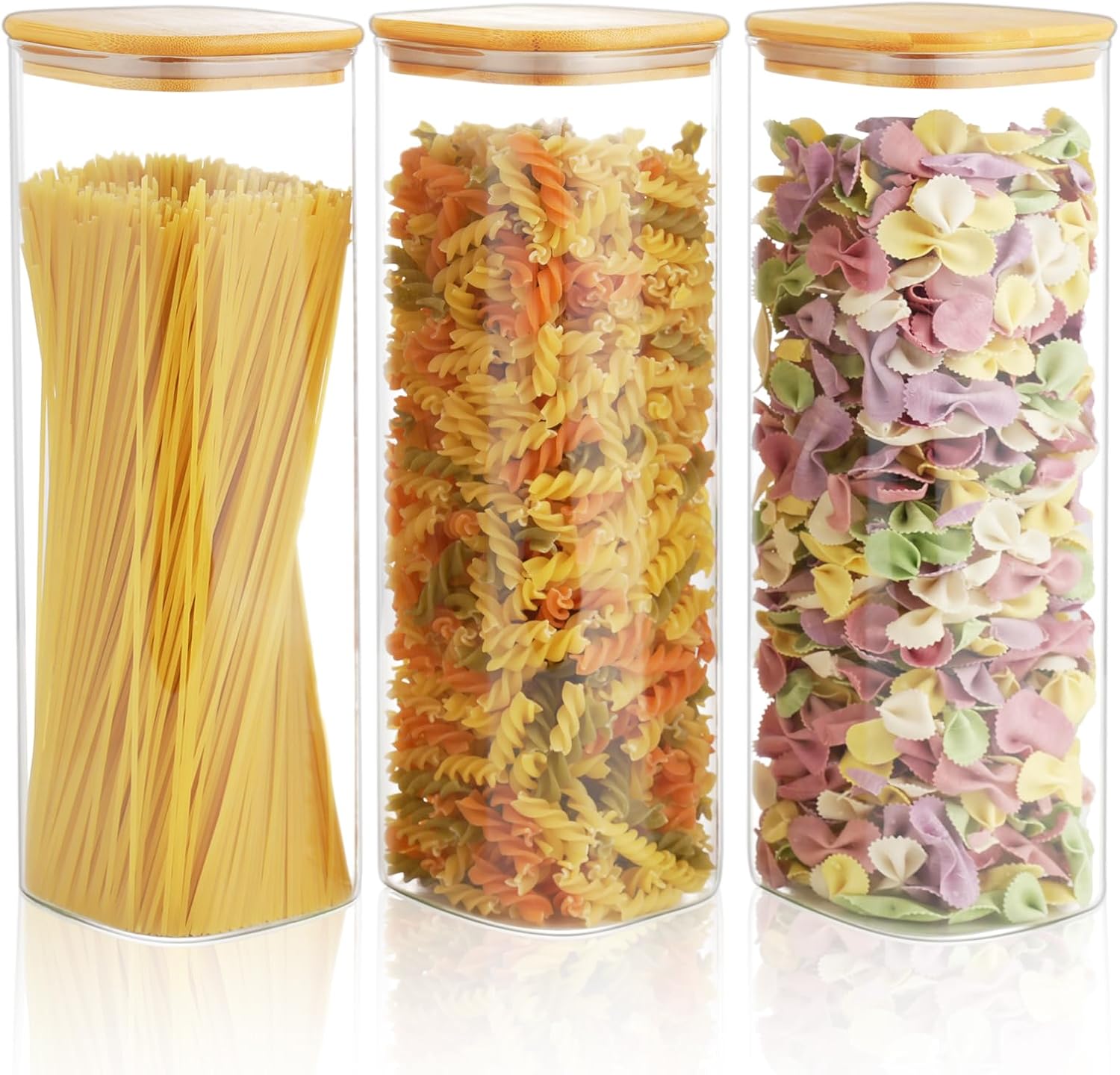 - 【3-Jar Set】: Each package includes 3 pantry storage jars measuring precisely 3.9" L × 3.9" W × 12" H (82 fl oz capacity), perfect for storing spaghetti, pasta, spices, coffee, candies, nuts, dried fruits, and other pantry essentials—whether you're organizing your kitchen, setting up a coffee bar, or just love a clutter-free countertop, these are a must-have: functional, minimal, and straight-up beautiful