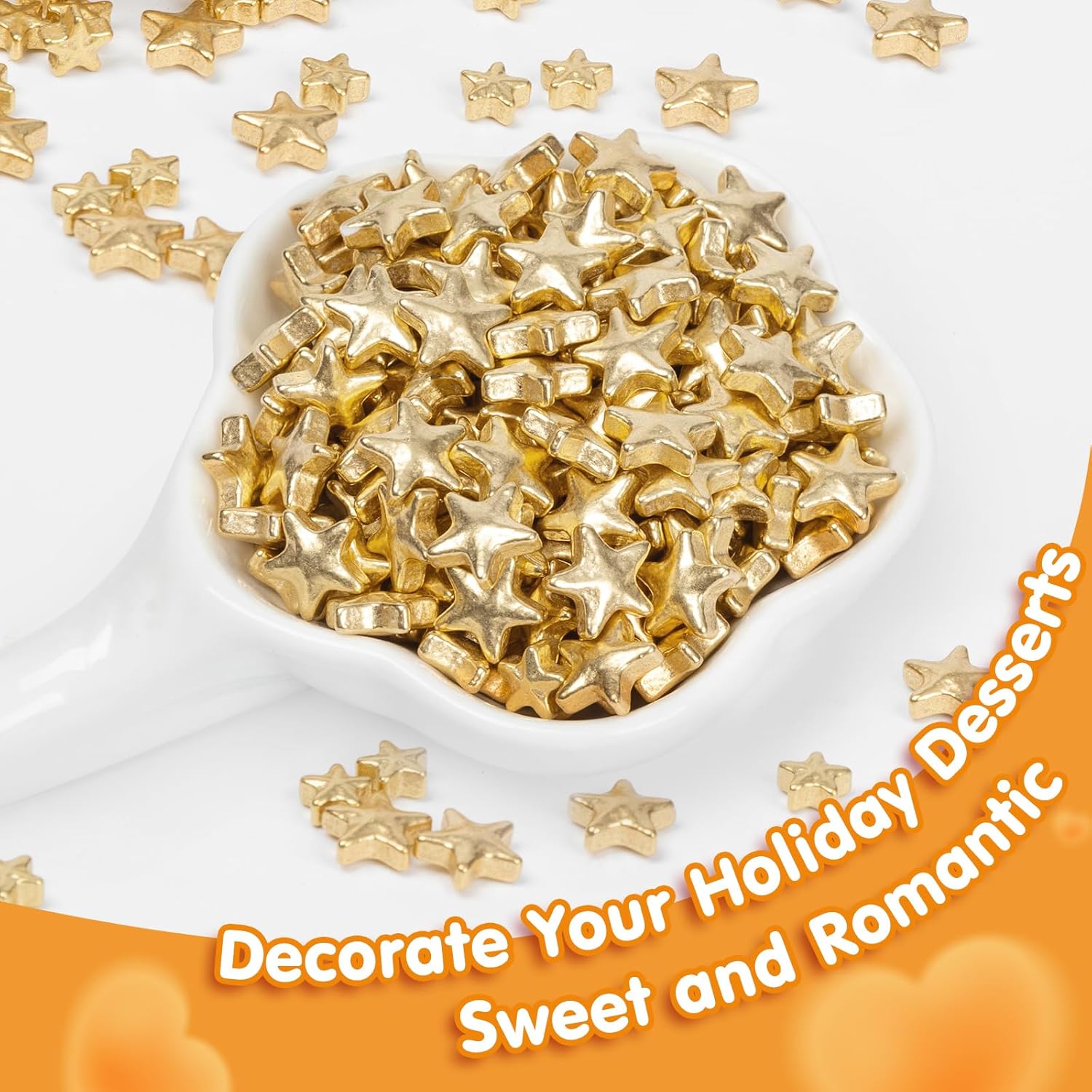 - Luxurious Gold Star Sprinkles:These bright Gold star sugar sprinkles mixes are classy for wedding and birthday cakes,holiday baking and decorating.These star sprinkle mixes are classy for birthday cakes,holiday baking and decorating anniversaries,Halloween, Christmas, New Yearβs,Valentine's Day and other special occasionsAnd you can also use them to embellish cookies,cupcakes,ice cream,fondant and pastries for added allure.secorating your favorite baked dessert with our mixing-sized lustrous Gold Star Sprinkles will surely elevate your presentation,and more to add party fun