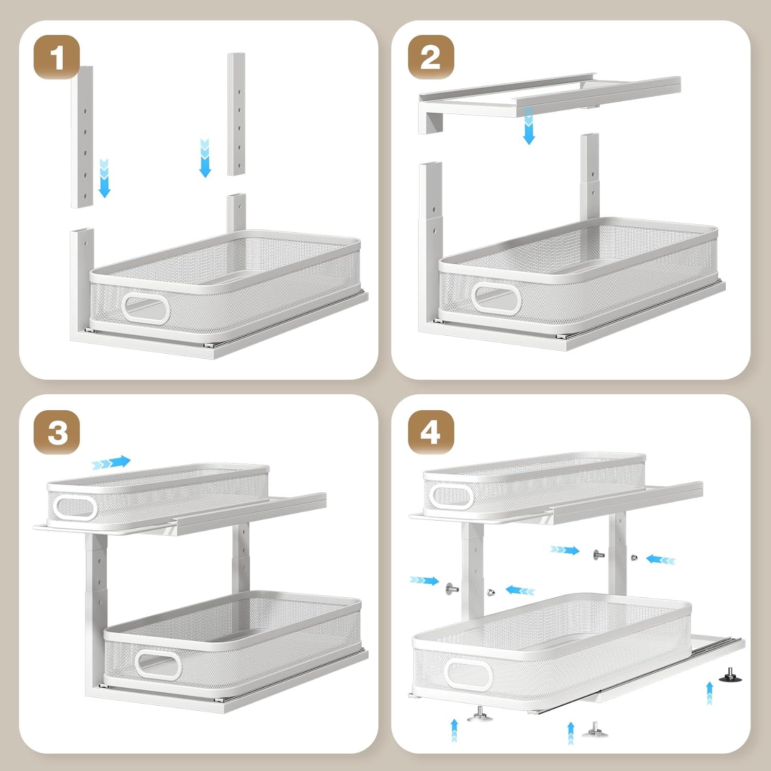 2 Pack 21IN-Depth Under Sink Organizer With Next-Gen Ball-Bearing Slides,2-Tier Precision Mesh Pull Out Cabinet Storage for Bathroom&Kitchen,Height Adjustable Drawers Shelf,Anti-rust-White