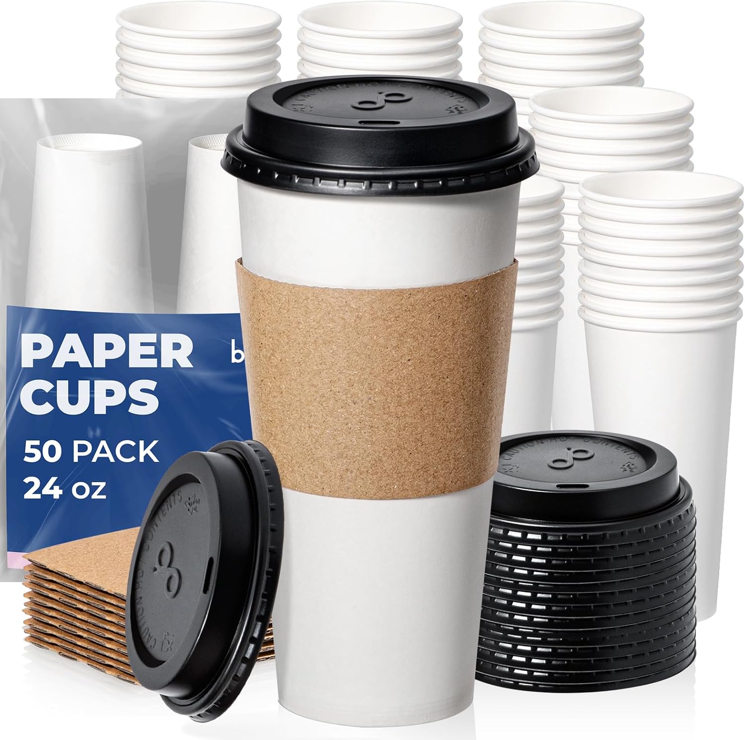 Fit Meal Prep 24 oz 50 Pack To Go Coffee Cups with Lids and Sleeves, Disposable Paper Coffee Cups with Lids for Hot/Cold Beverage