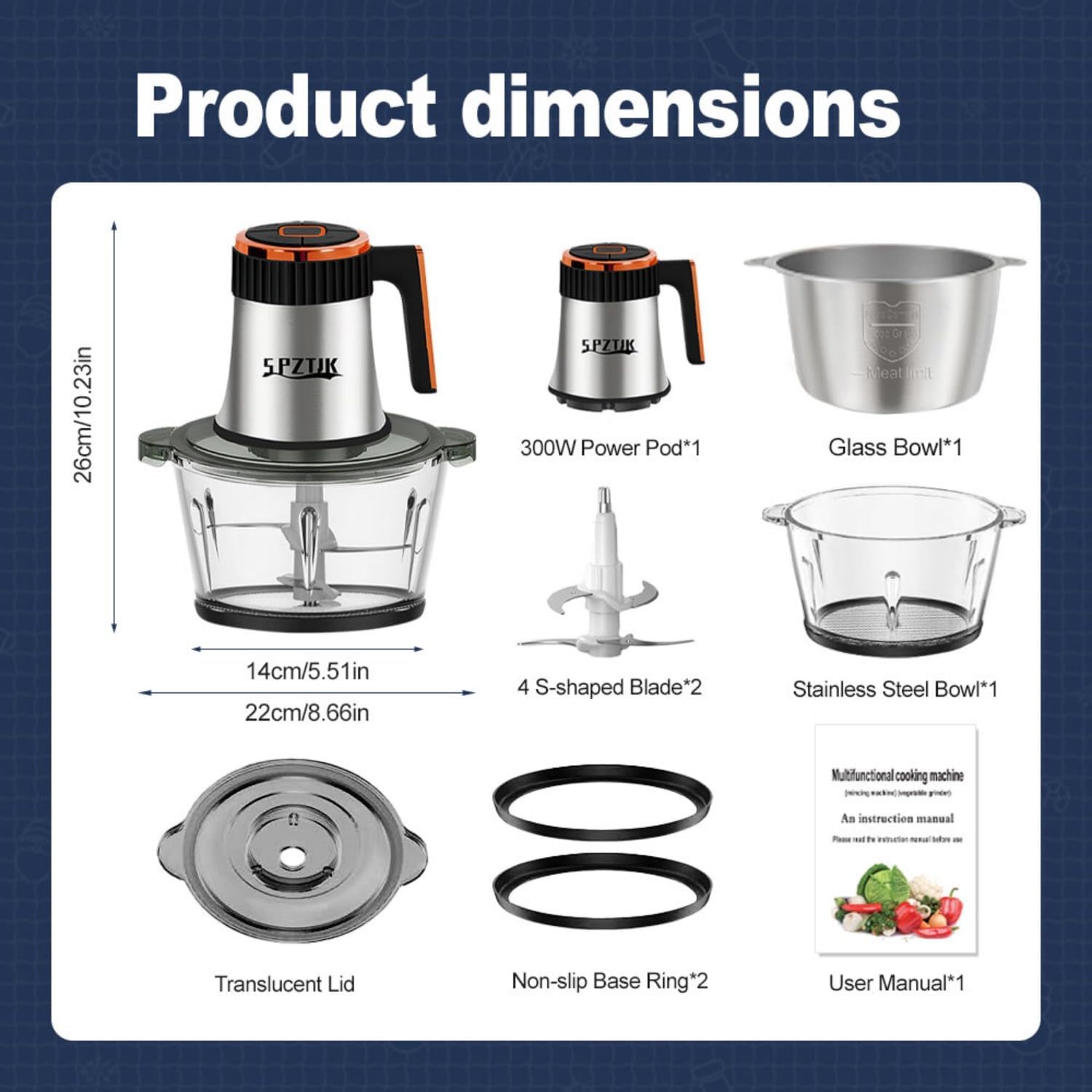 - 【Indispensable Kitchen Helper】SPZTJK food processor features dual bowls (8-Cup glass & 8-Cup stainless steel) and 2 sets of 4 bi-level blades. Perfect for chopping meat, veggies, nuts, fruits, or creating salads, guacamole, salsa, burgers, and more! A versatile tool for countless kitchen tasks.