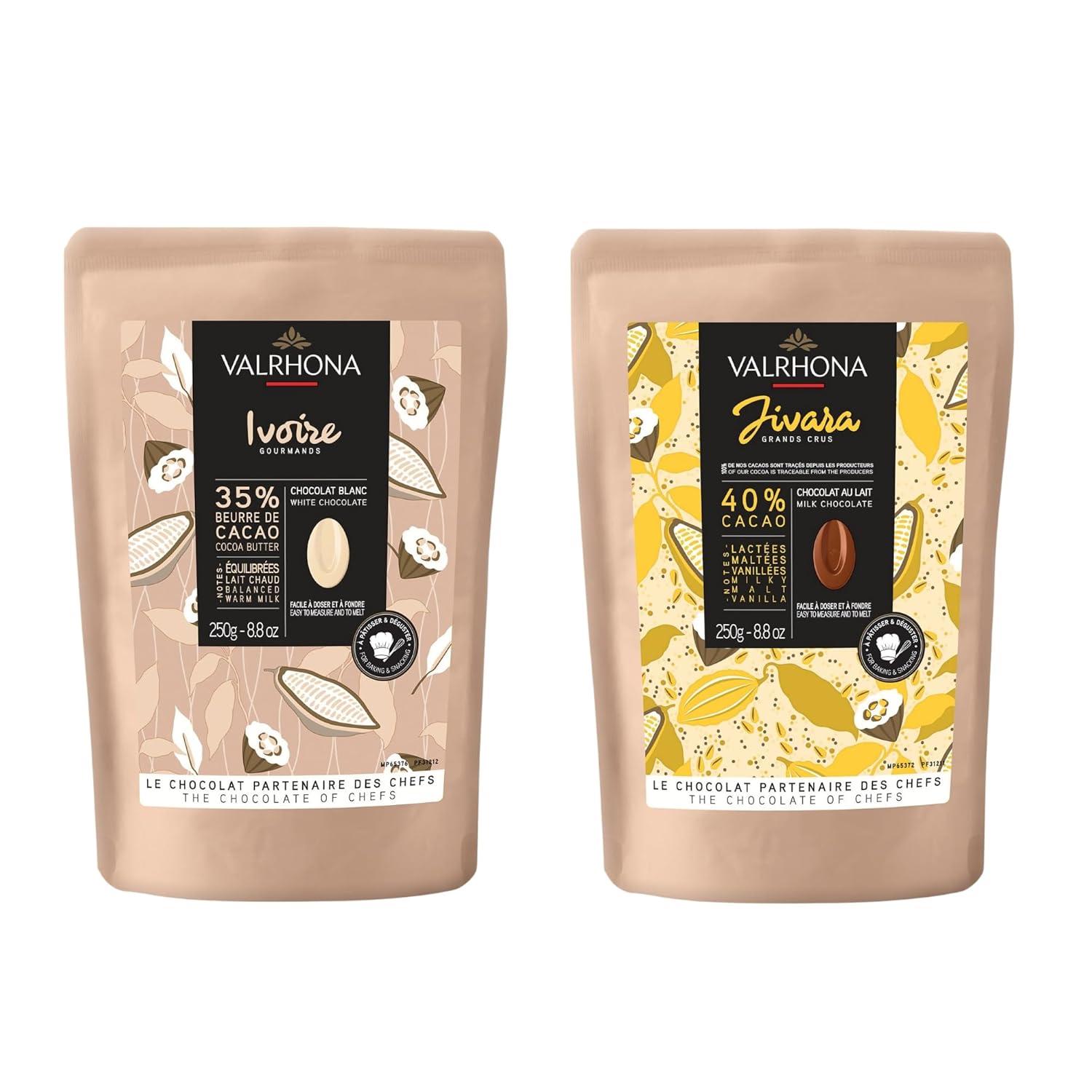 Valrhona Premium Baking Chocolate Discs (Feves), Creamy JIVARA 40% w/Hints of Vanilla and Malt, and Milk Chocolate IVOIRE 35% w/Hints of Vanilla & Warm Milk, For Cookies, Cakes, and more