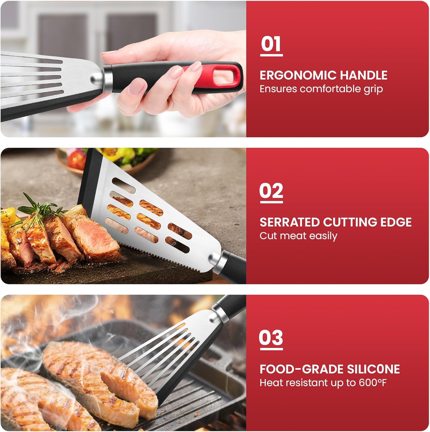 - 【Ergonomic Silicone Handle】The fish spatula handle is encased in silicone, contoured to fit palm curvature for sustained comfort. Its exceptional heat resistance prevents deformation when exposed to heat sources, ensuring safety and structural integrity during cooking