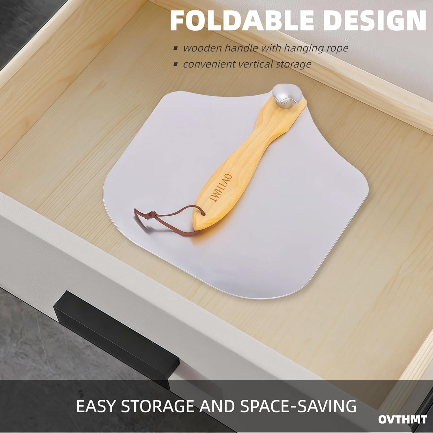 - PREMIUM DESIGN: The metal pizza paddle is 1.5mm thick and weights 2.08 lbs. The foldable design wooden handle ensures space-saving storage, while the built-in hole with a hanging rope enables vertical placement.