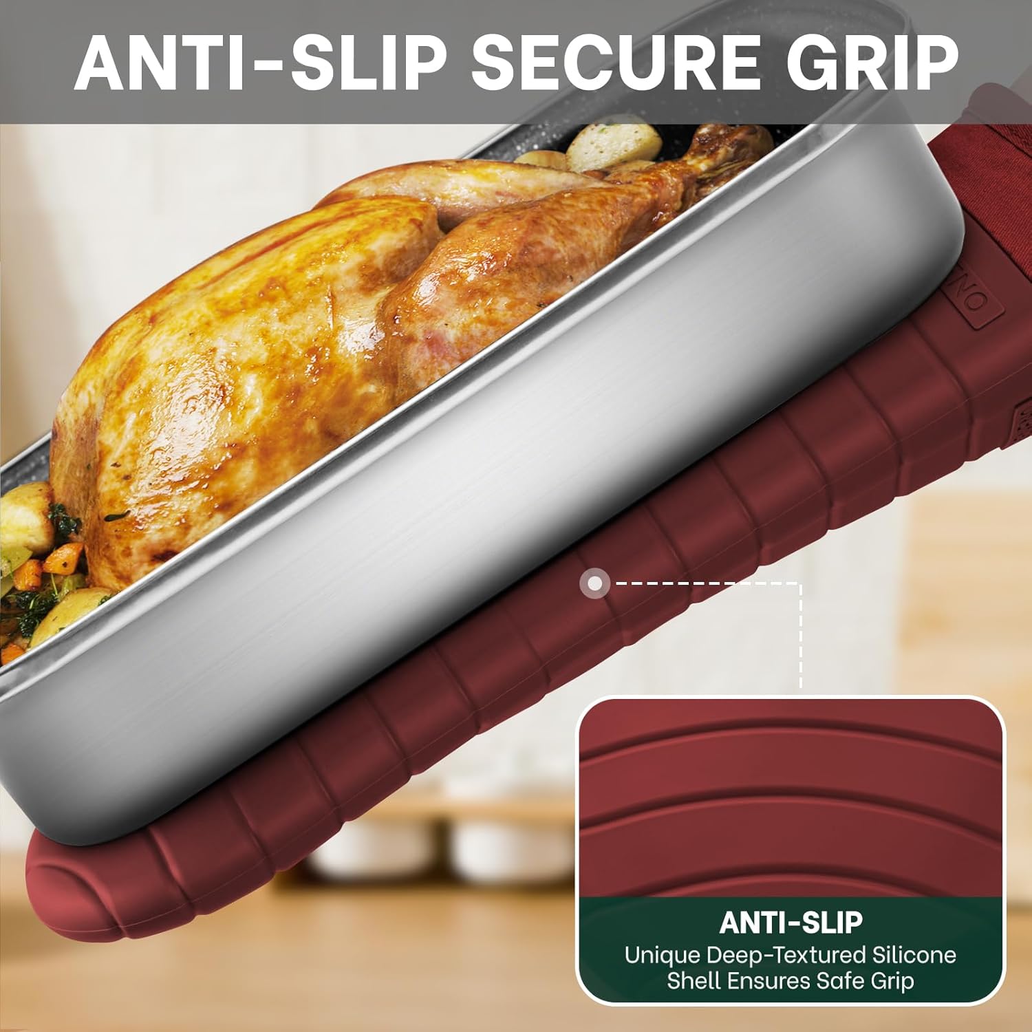 Beneno BPA-Free Silicone Oven Mitts, Heat Resistant Waterproof Oven Mitts with Non-Slip Textured Grip, Comfortable Quilted Lining, Kitchen Pot Holders for Cooking, Baking, Grilling, 7"x13", 2Pcs Red