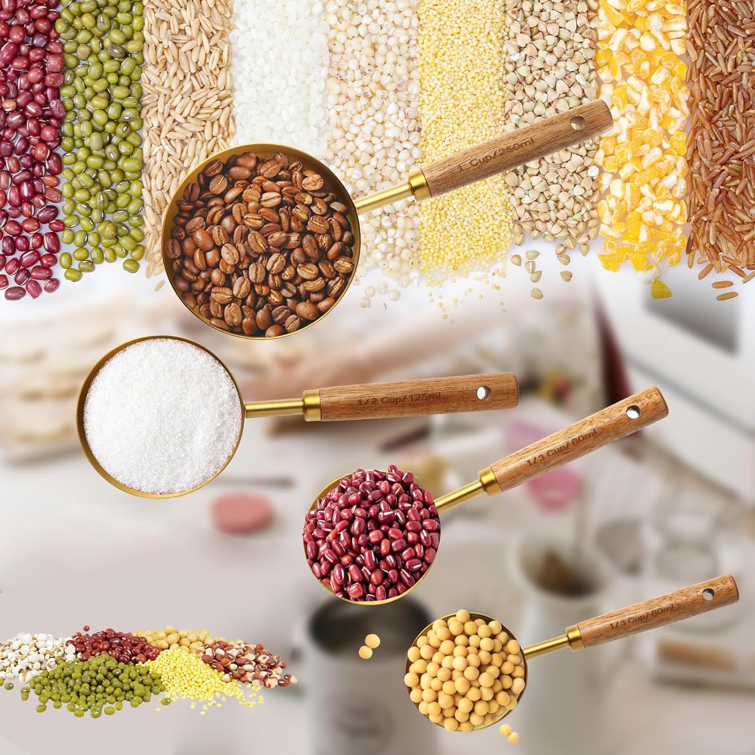 - 【Elegant Design】The elegant gold color and natural wooden handle make our wooden measuring cups and spoons set have both modern and retro styles. It is not only a practical tool but also a work of art that highlights your style.