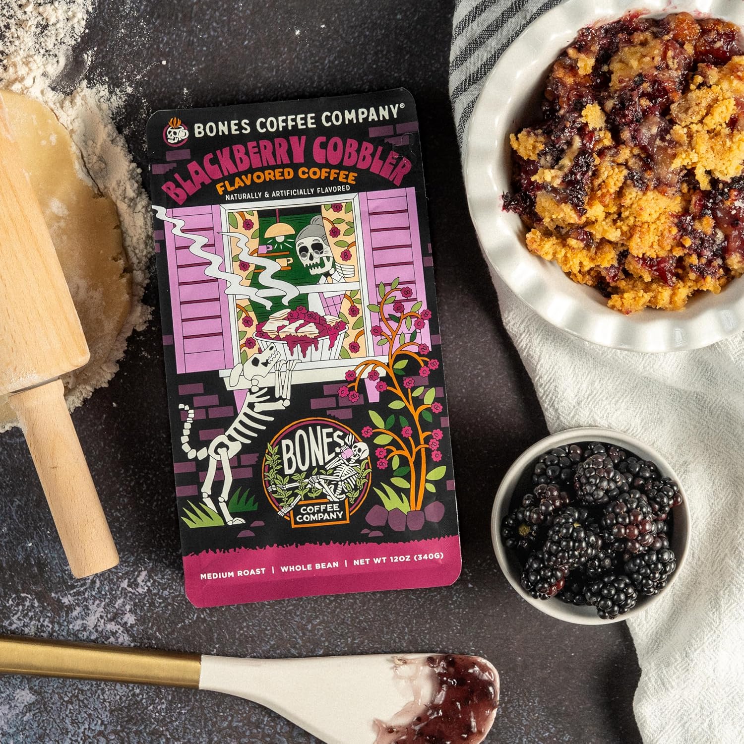 Bones Coffee Company Blackberry Cobbler Flavored Coffee Beans, Whole Bean Coffee Medium Roast Low Acid, Blackberry Cobbler Flavor (12 oz)