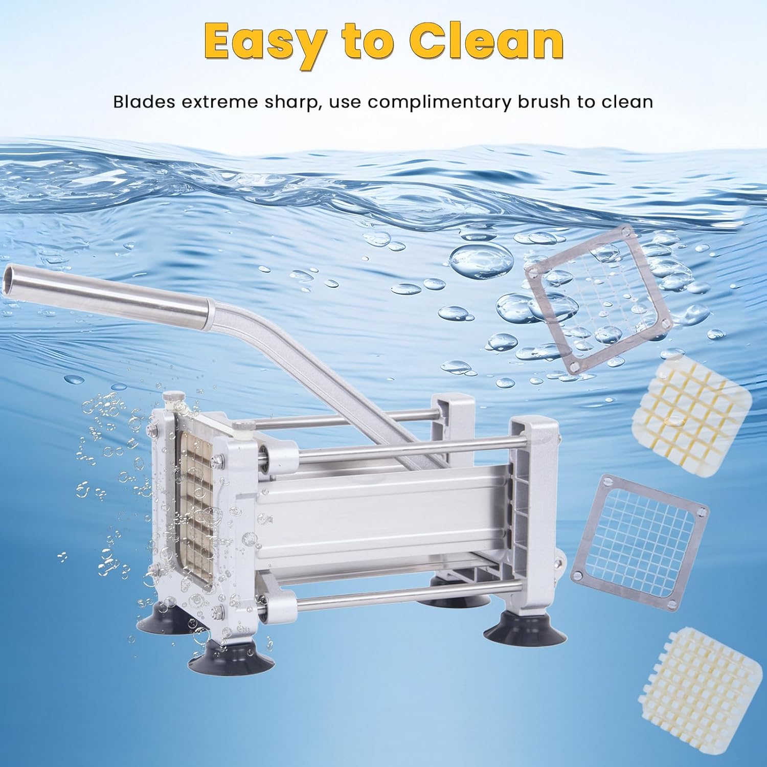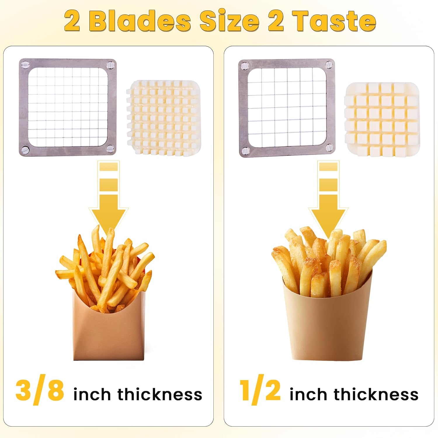 - 3 SHARP STAINLESS STEEL BLADES β Comes with three interchangeable blades (1/4" Shoestring, 3/8" Classic, 1/2" Wide Fry) for restaurant-quality fries every time. Easily switch sizes for any recipe or preference.