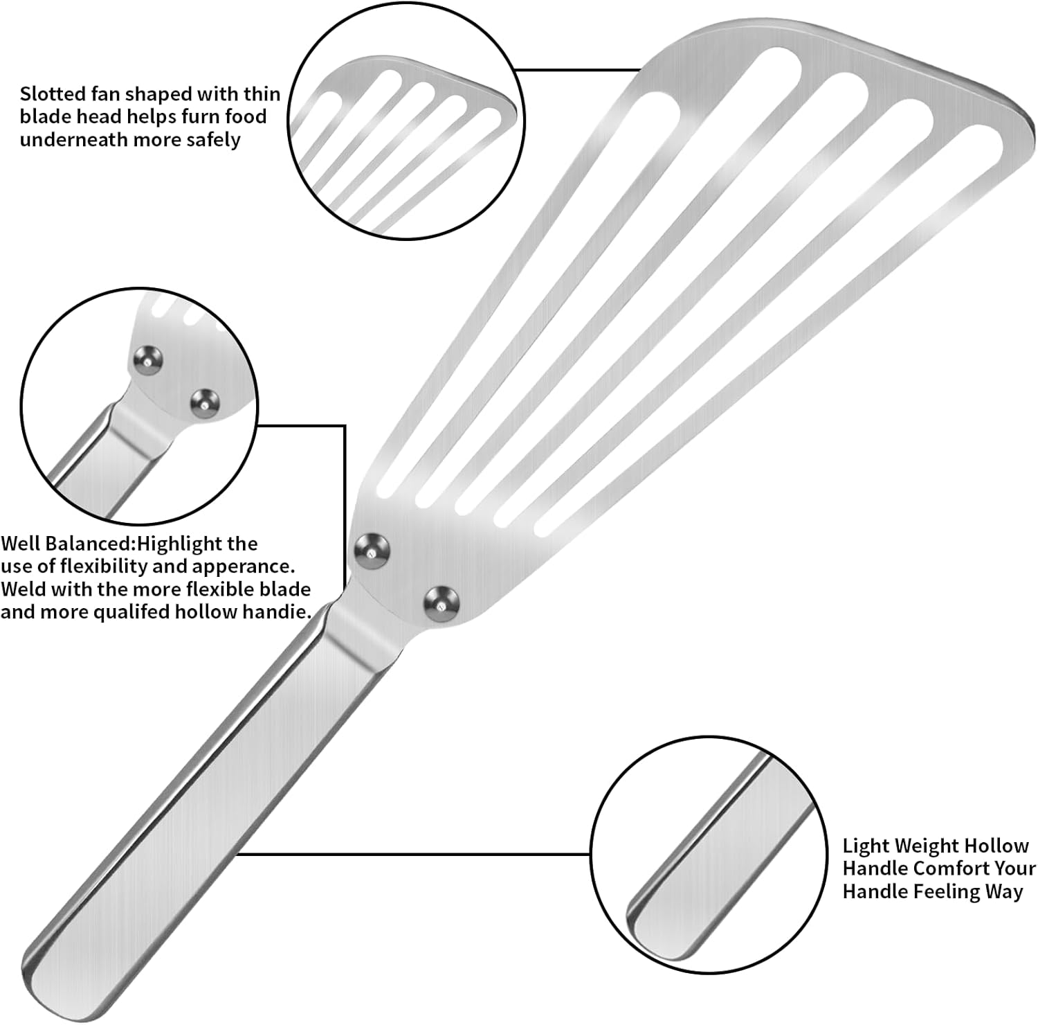 KSENDALO Flexible Fish Spatula Stainless Steel -Slotted Thin Egg Flipper with Riveted Handle, Angled Blade & Hollow Grip, Metal Turner for Cooking Fish Egg Pancakes (2 pack)