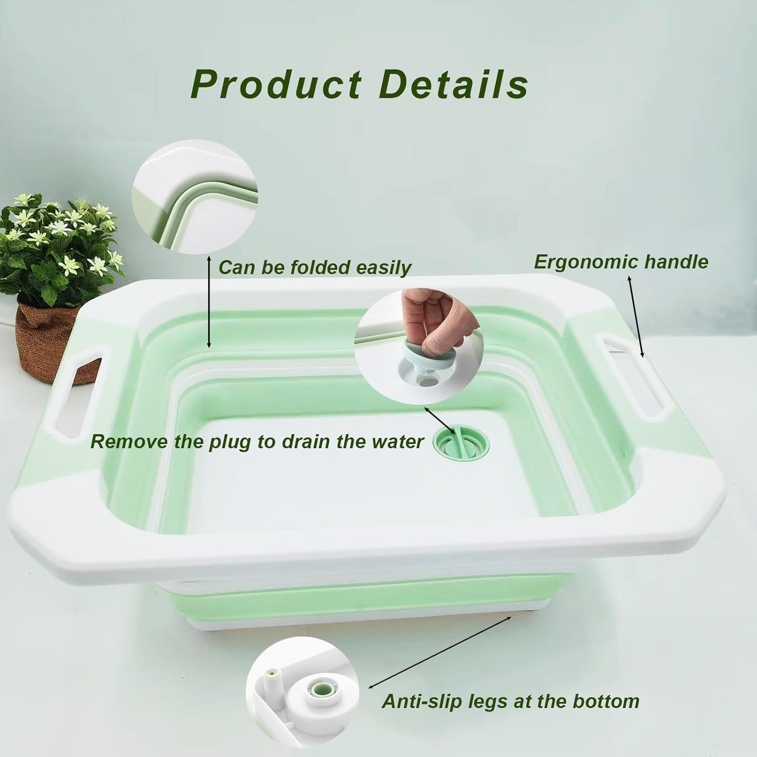Camping Collapsible Cutting Board Dish Basin BBQ Prep Tub Camp Sink Dish Washing Station Multifunctional Storage Basket(Green white)