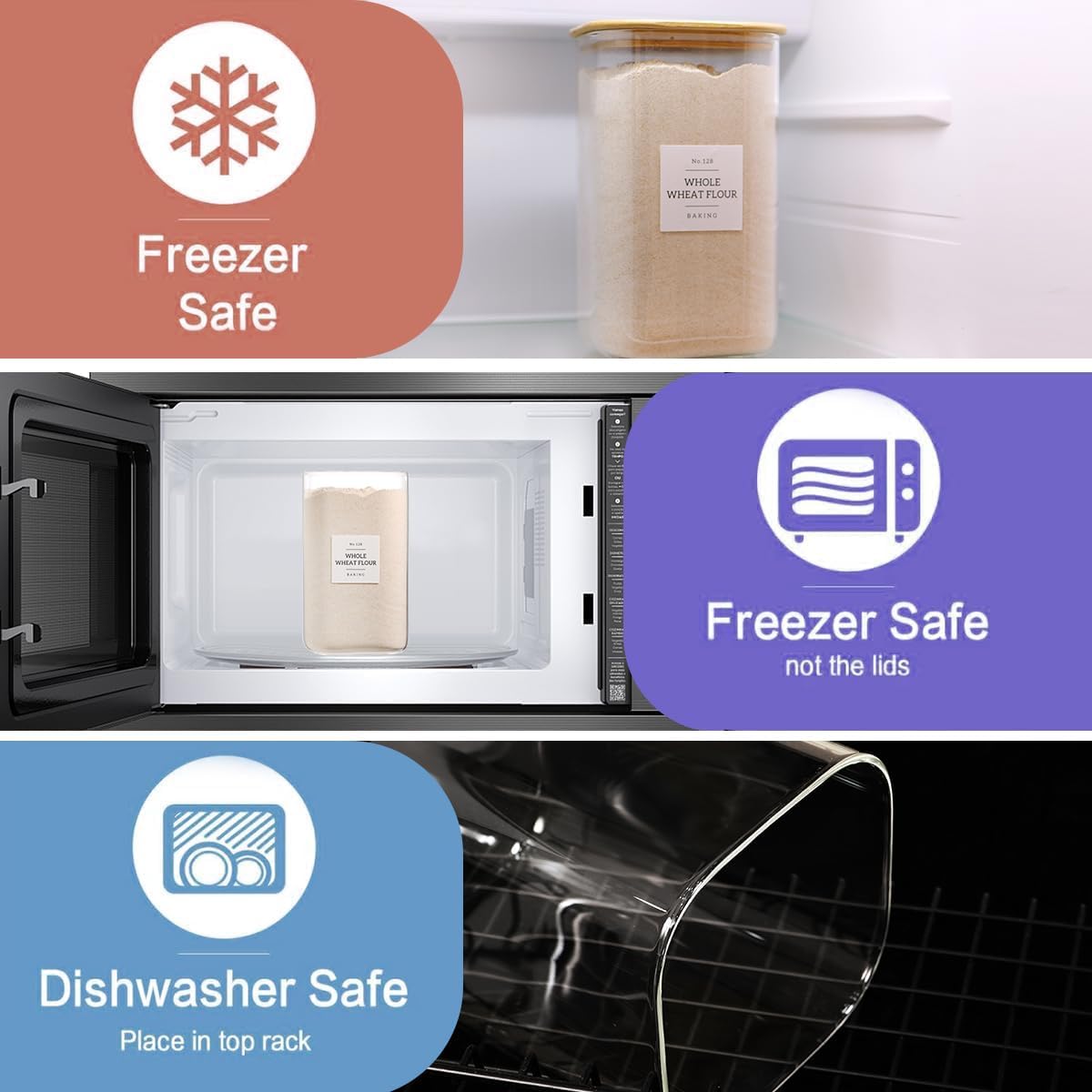 - 【Versatile & Extreme Temperature Resistant】Engineered for extreme temperatures! Our glass kitchen jars are effortlessly versatile: microwave-safe for quick reheating, freezer-safe for long-term storage, and even oven-safe. flour sugar jars are your perfect, all-in-one solution for storing, cooking, reheating, and serving, transitioning seamlessly from cold to hot.