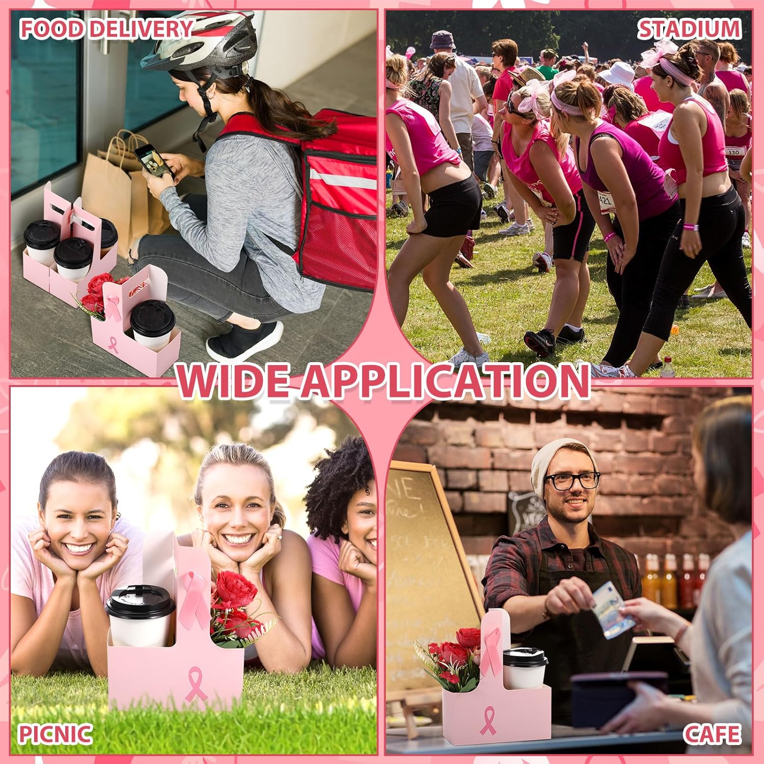 TaoBary 25 Set Breast Cancer Awareness Gifts 2 Cup Drink Carrier with Handle Pink Portable Foldable Tray Drink Holder Breast Cancer Gifts for Woman Disposable Coffee Cup Holder with Pink Ribbon
