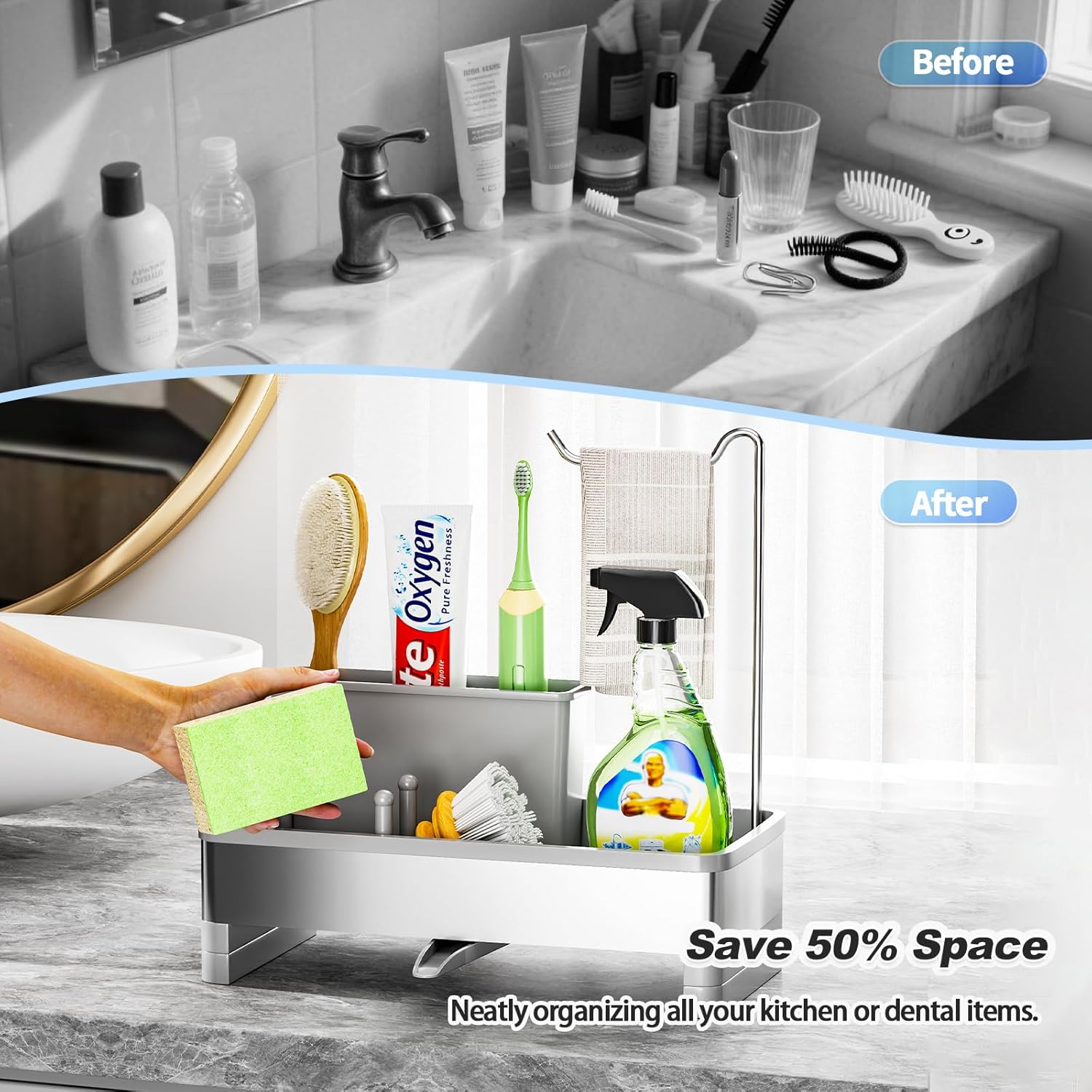 - 【Removable Brush Holder & Dish Cloth Hanger】It not only serves as a sink sponge holder, but also comes with a removable brush holder that can accommodate brushes of different sizes. It also features a towel rack that allows your dish towels to hang and dry easily. Our sink caddy allows you to organize and store kitchen cleaning supplies more efficiently, saving space in your kitchen.