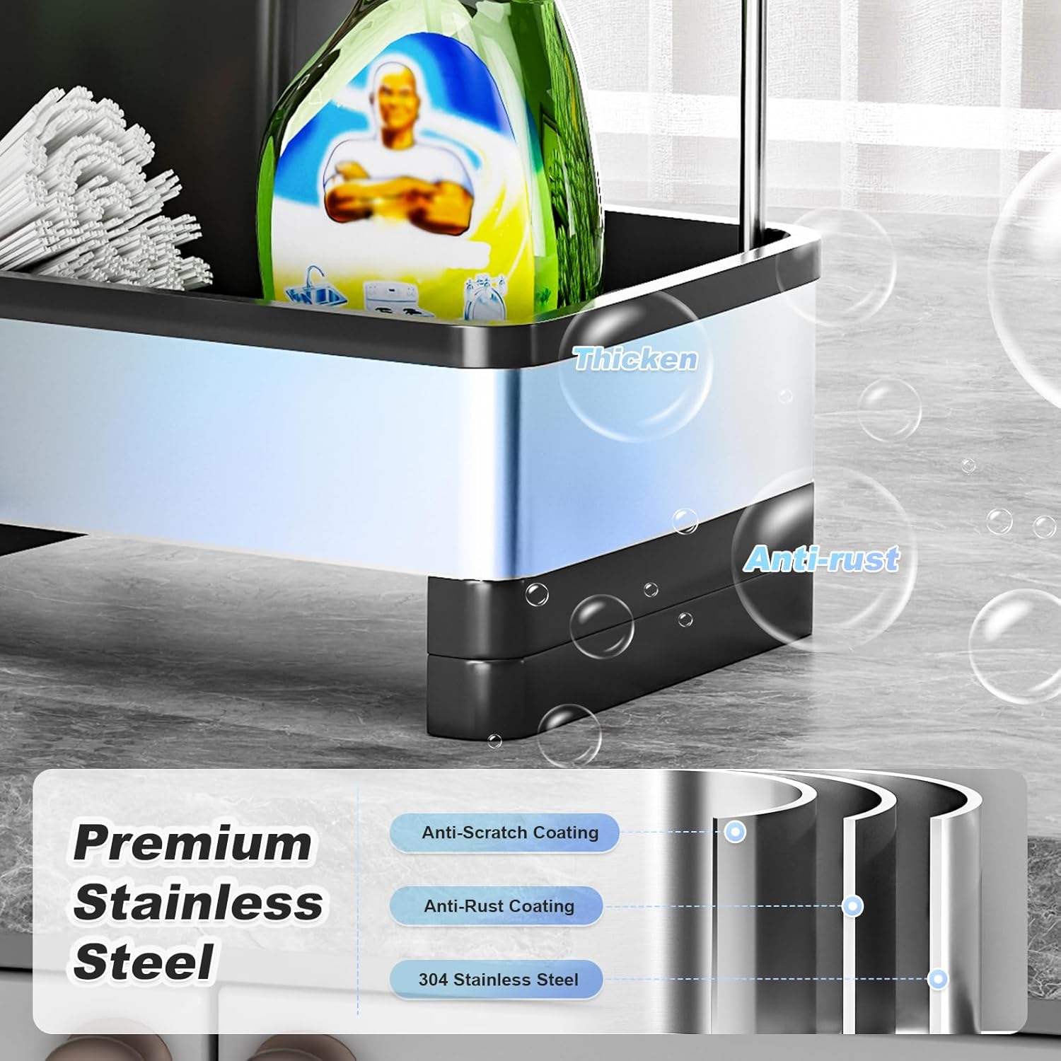 - 【Premium Stainless Steel Material】The kitchen sink caddy is made of high-quality stainless steel material,effectively preventing rust and deformation. It is easy to clean and highly durable. Its appearance features a stylish metallic texture, resistant to fingerprints and stains. The bottom of the sponge holder has anti-slip rubber to protect the countertop from scratches.