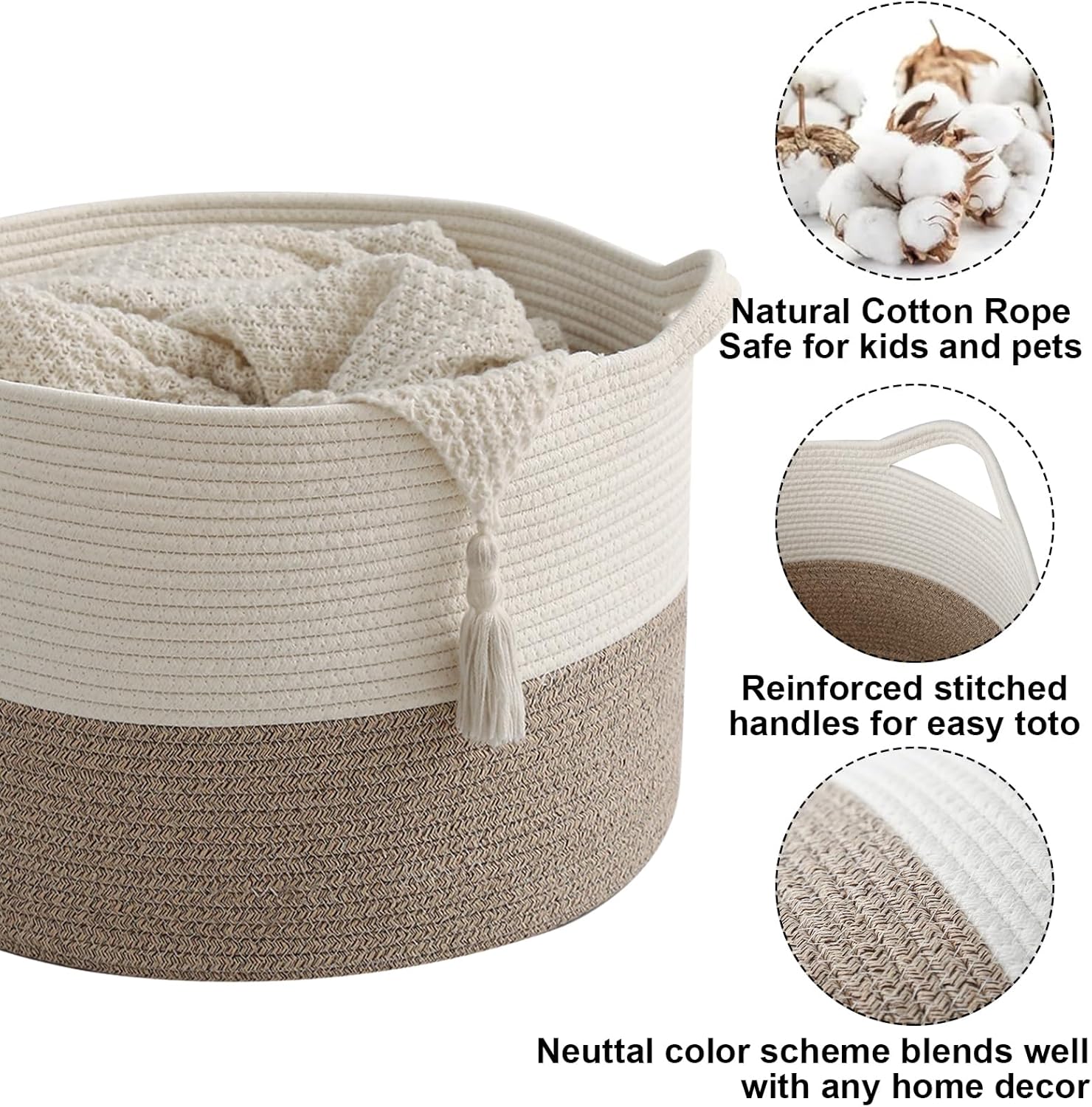 - 【Sturdy Handle Design】The two built-in handles are sturdy, easy to carry or move and allow you to pack up their alone. The woven basket is made of cotton rope, which is soft yet holds its shape well.No need to worry about scratching clothes or hurting skin, suitable for families or pets