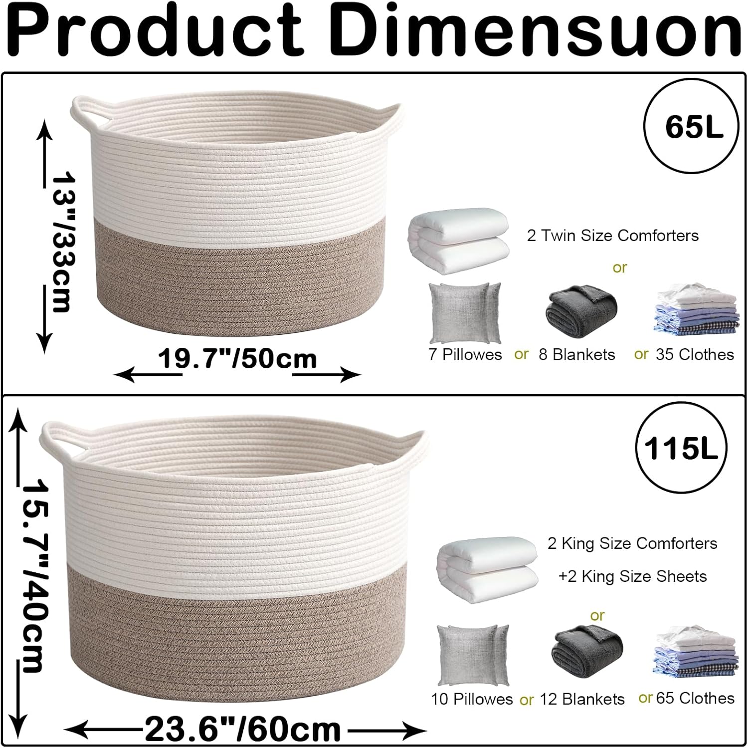 - 【Large Laundry Blanket Basket】23.6"L x 23.6"W x15.7"H Laundry basket for organizer,115L rope large cotton blanket basket with handle.Please allow 1 - 2 cm (0.4" - 0.8") for deviations due to folded transportation