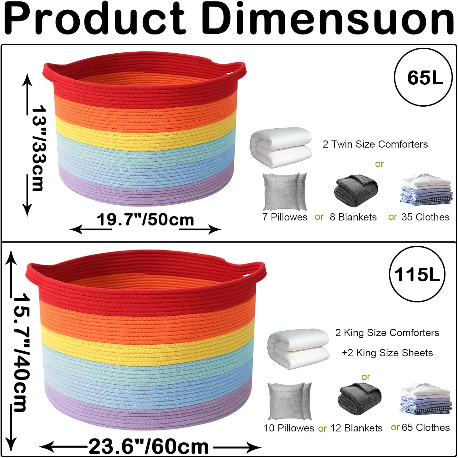 Large Blanket Basket for Organizing,65L Closet Organizers and Storage Bins Box for Shelves Woven Rope Storage Baskets,Living Room,Bedroom,Dorm,Laundry room (Rainbow)