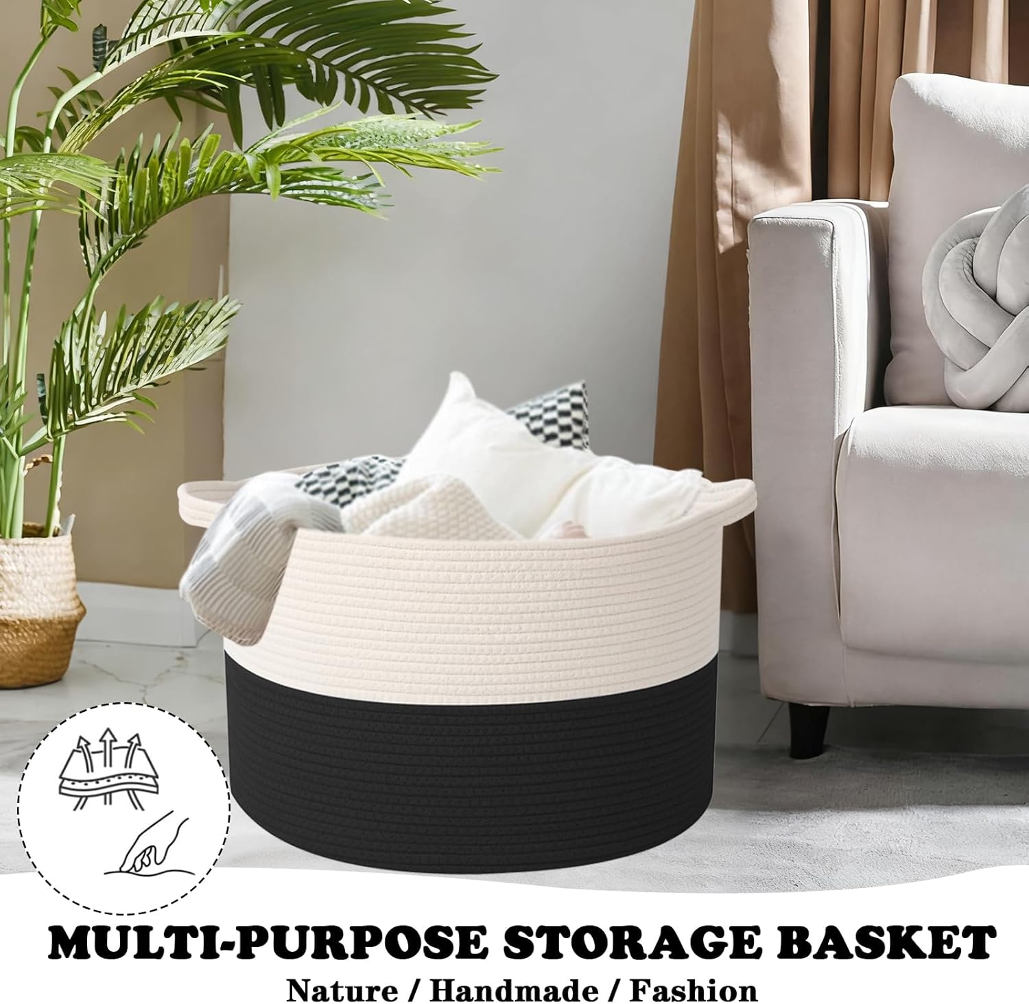 Large Blanket Basket for Organizing,65L Closet Organizers and Storage Bins Box for Shelves Woven Rope Storage Baskets,Living Room,Bedroom,Dorm,Laundry room (White&Black)
